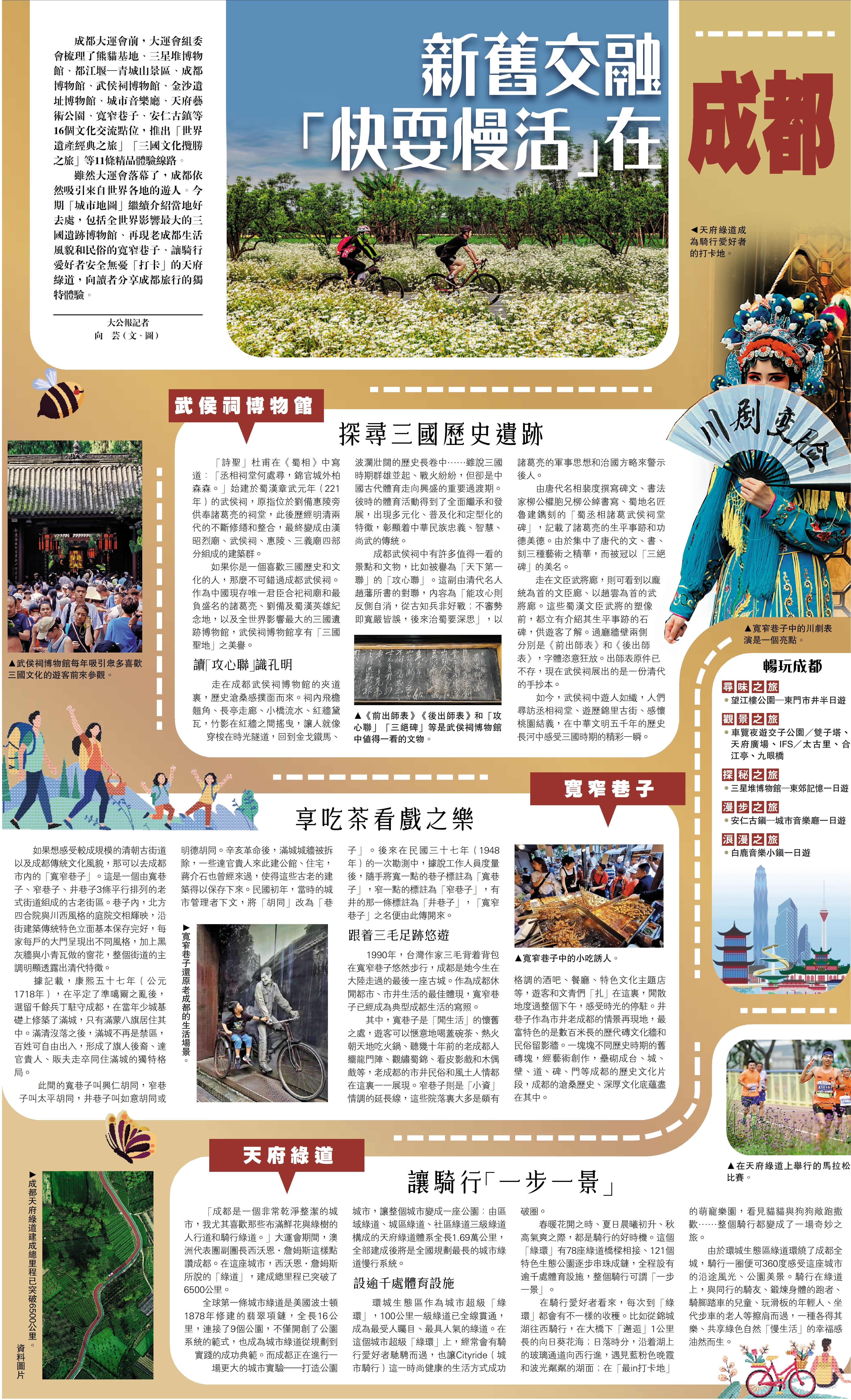 雖然大運會落幕了,成都依然吸引來自世界各地的遊人。今期「城市地圖」繼續介紹當地好去處,包括全世界影響最大的三國遺跡博物館、再現老成都生活風貌和民俗的寬窄巷子、讓騎行愛好者安全無憂「打卡」的天府綠道,向讀者分享成都旅行的獨特體驗。\大公報記者向芸(文、圖)