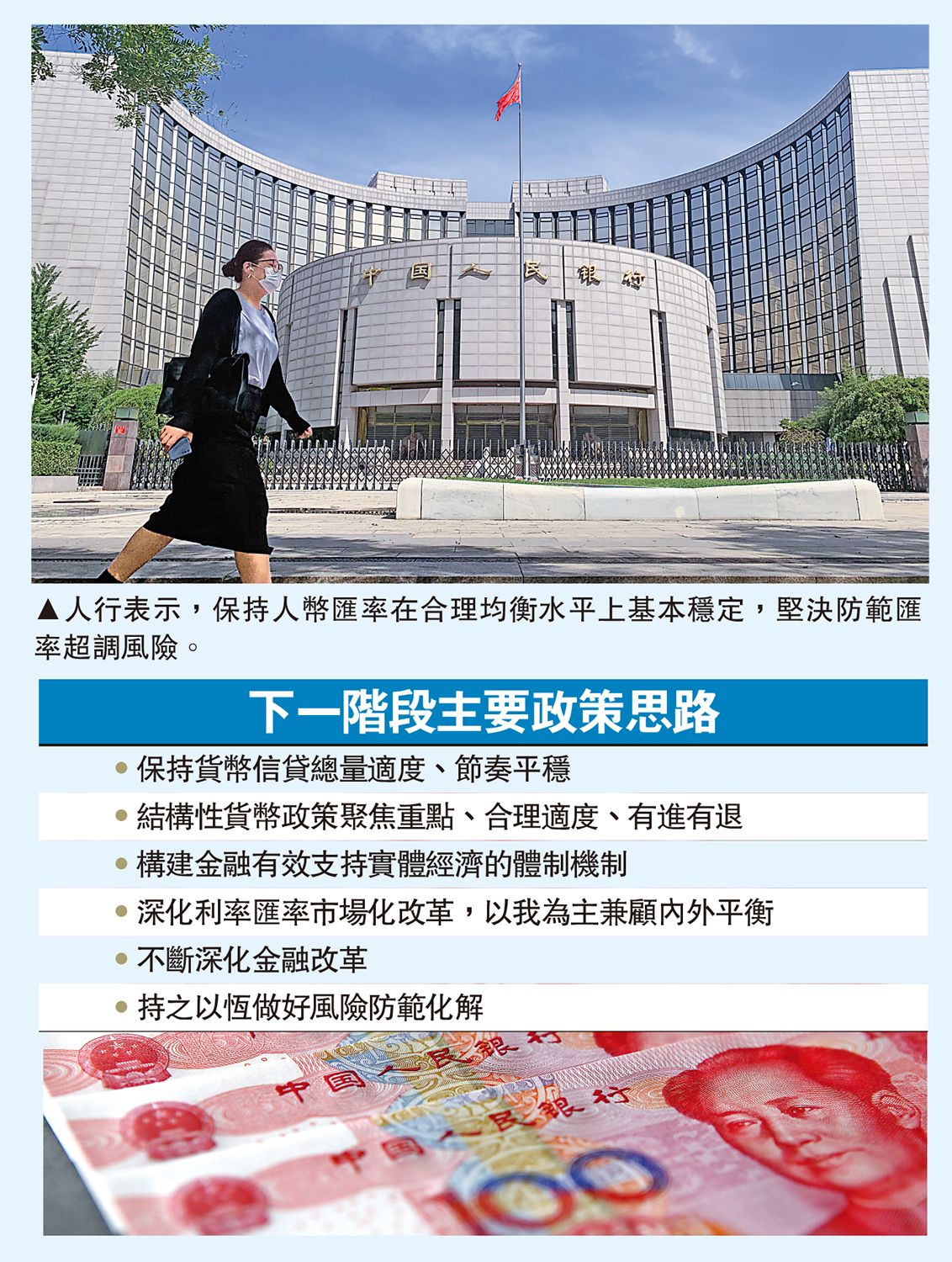 中國人民銀行在「2023年第二季度貨幣政策執行報告」內表示,當前人民幣匯率沒有偏離基本面,外匯市場運行總體有序。人行及外匯管理局會綜合施策、穩定預期,保持人民幣匯率在合理均衡水平上的基本穩定,堅決防範匯率超調風險。昨日離岸、在岸人民幣匯價一度分別跌至7.34及7.31關,報告發布後,離岸人民幣曾收復7.30關口。在岸人民幣方面,中國貨幣網晚上7時的在岸人民幣兌美元參考匯率報7.2794。\大公報記者 彭巧容