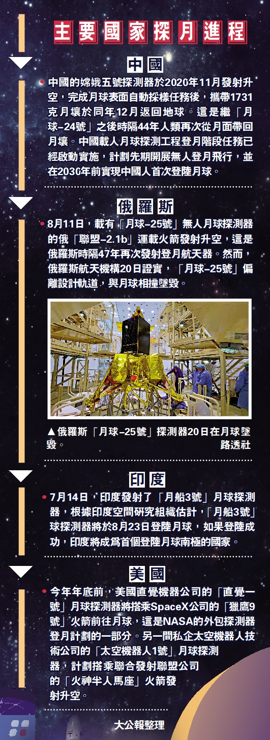 •8月11日,載有「月球-25號」無人月球探測器的俄「聯盟-2.1b」運載火箭發射升空,這是俄羅斯時隔47年再次發射登月航天器。然而,俄羅斯航天機構20日證實,「月球-25號」偏離設計軌道,與月球相撞墜毀。
