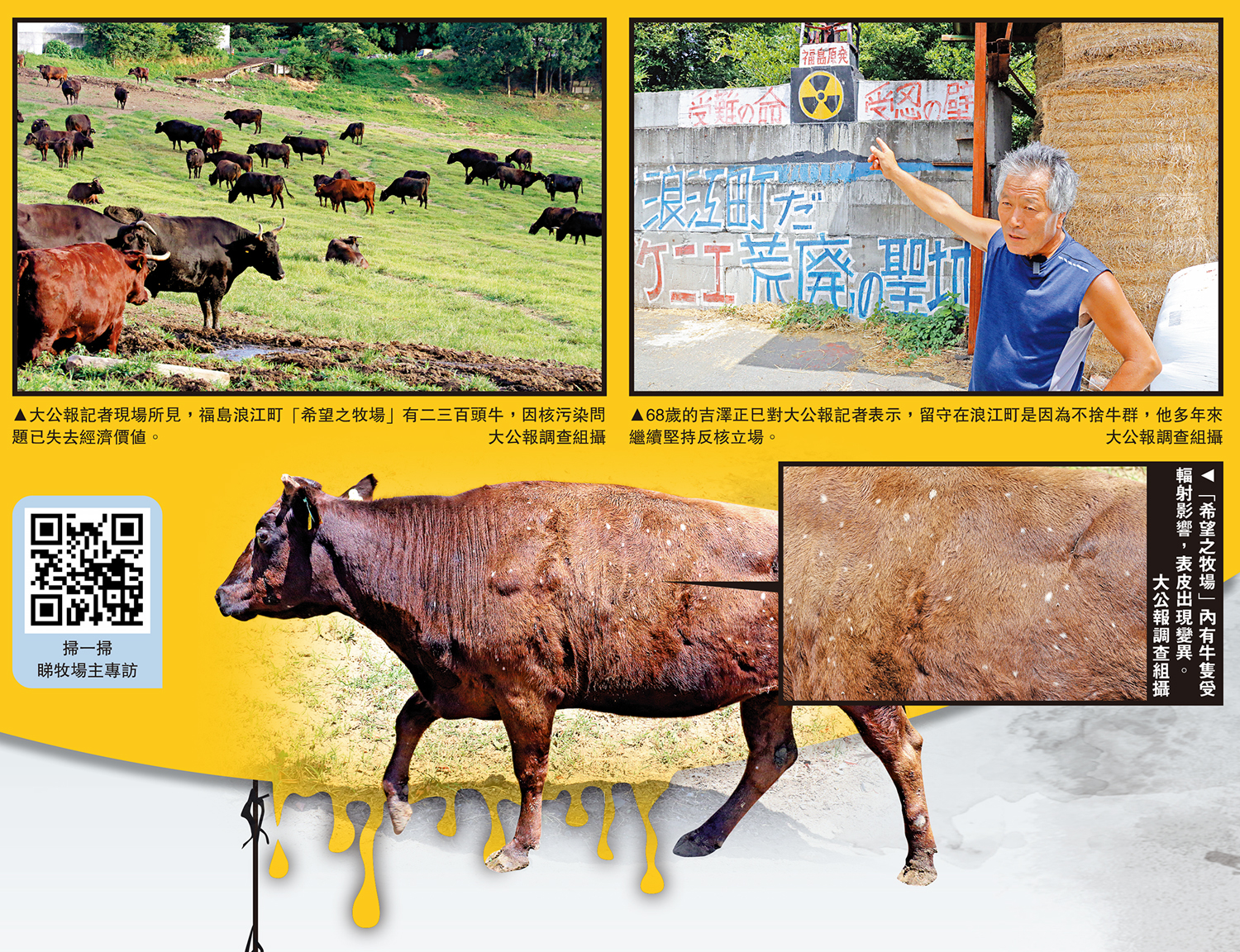 現年68歲的吉澤正巳在距離福島第一核電站14公里的浪江町經營「希望之牧場」多年,在他的牧場裏有許多牛隻,但因為核污染問題已失去經濟價值。