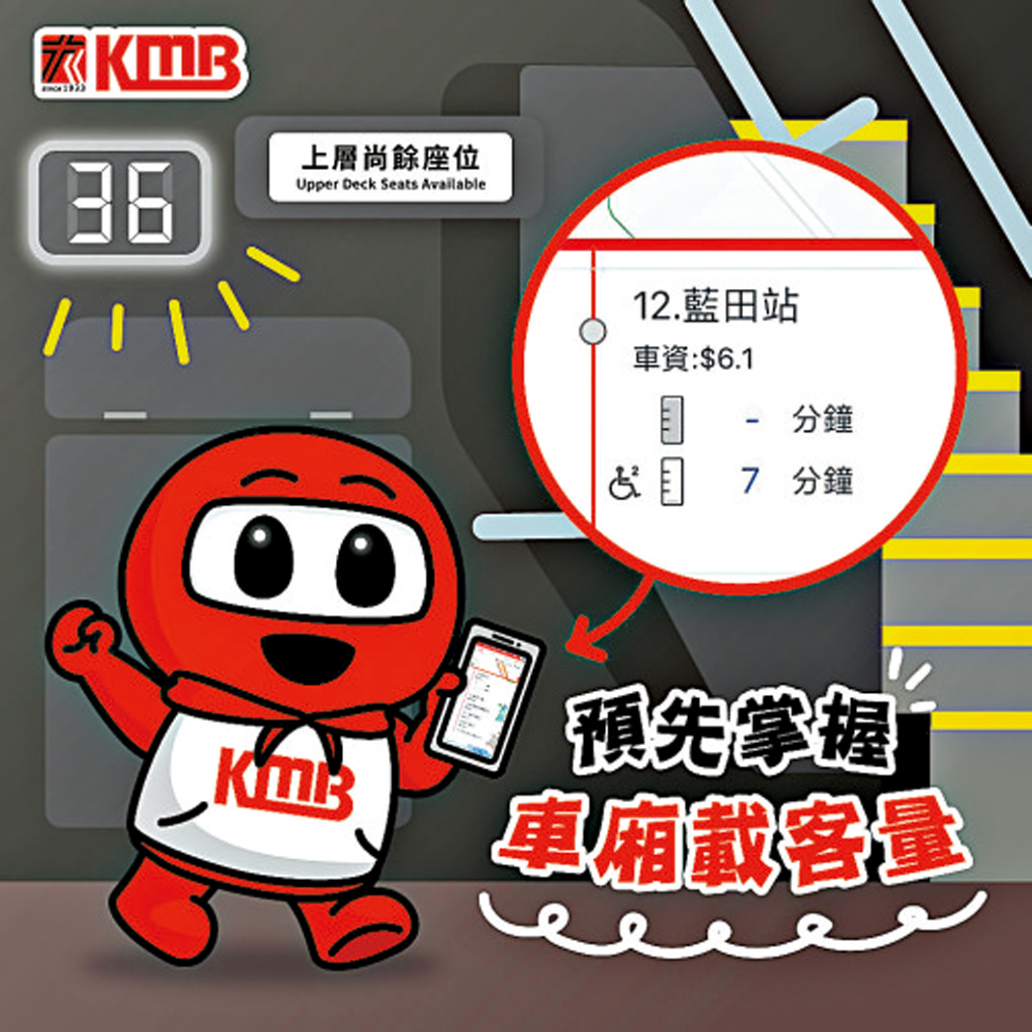不少人搭巴士都希望有位置坐,無奈不知道巴士的實際載客量。為提升乘車體驗,九巴試行在手機應用程式App1933,實時顯示車廂載客量,方便乘客知道即將抵達班次的載客情況。候車乘客只需觀察應用程式內到站時間旁邊的「間尺」圖案,就可以得知實時車廂載客量,若「間尺」圖案已填滿一半,代表車上載客情況為「半滿」。