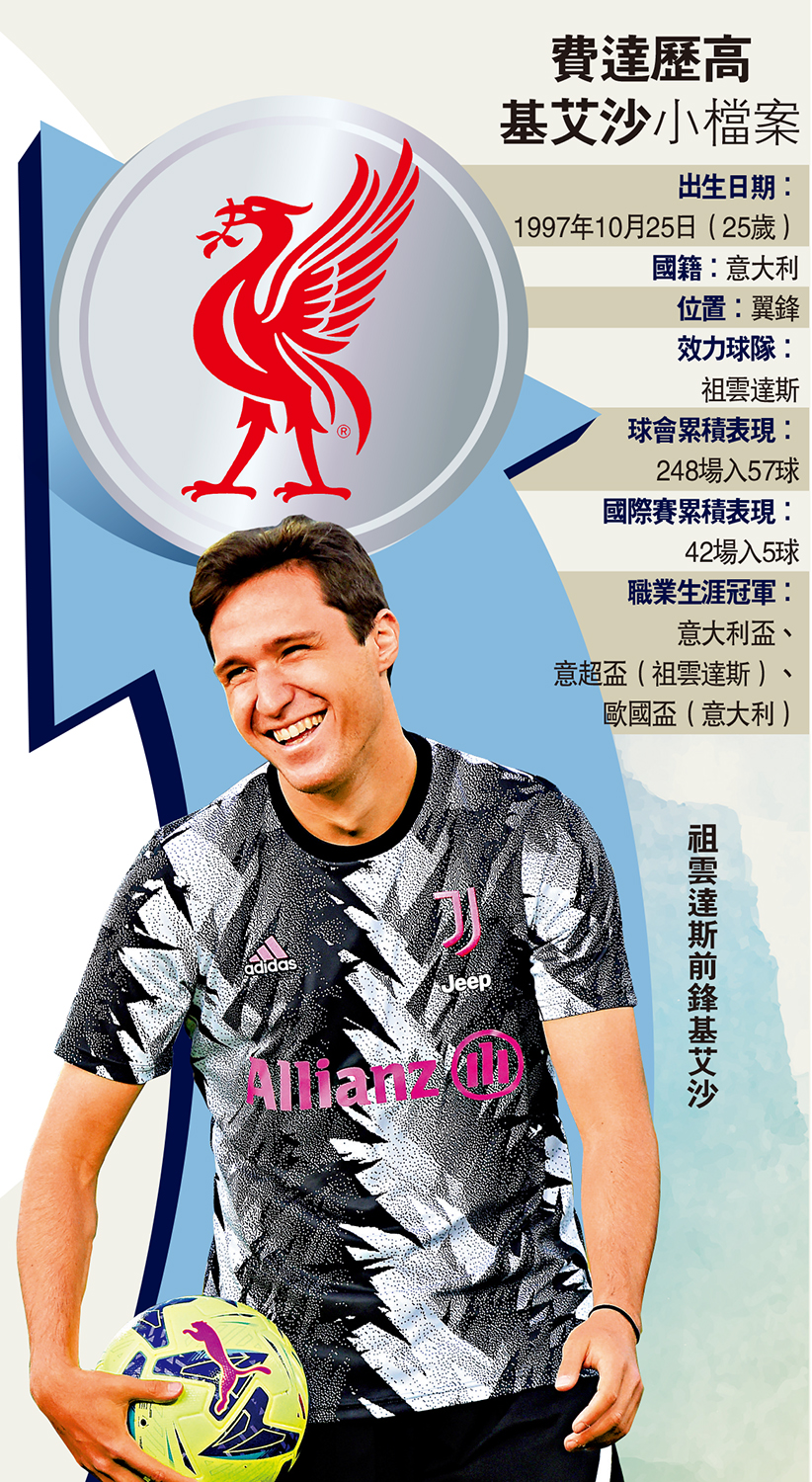 利物浦近兩季已購入達雲紐尼斯及加普代替文尼及法明奴,把沙拿也賣走便算完成前鋒線換血,高洛普其實一直都很欣賞費達歷高基艾沙,這名25歲意大利翼鋒於2021年歐國盃表現出色,成為球隊贏得歐國盃的功臣,更因此得以自費倫天拿轉投豪門祖雲達斯,不過他去年頭因前交叉韌帶撕裂長休大半年,在缺陣45場賽事後復出,經過去季尾調整狀態後,表現已回升,今季意甲開鑼作客烏甸尼斯,基艾沙射入1球助球隊大勝3:0。基艾沙技術全面,應有力取代沙拿位置,如今賣出沙拿可獲1.5億英鎊,他們將可向祖雲達斯報價5000萬英鎊收購基艾沙完成換鋒計劃,還有1億英鎊落袋,可說一舉兩得。
