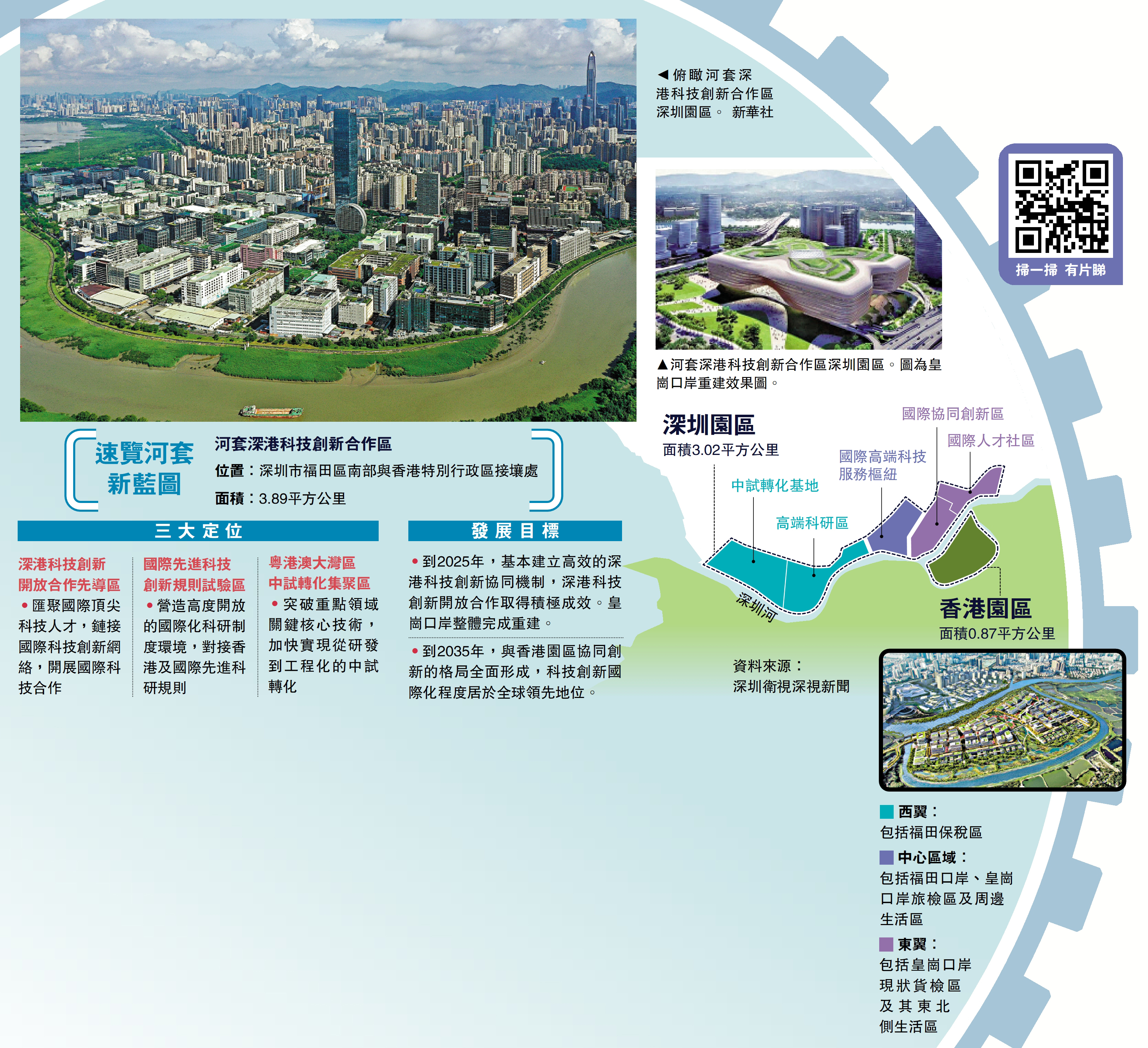 2017年,深港兩地簽署合作備忘錄,共同開發河套深港科技創新合作區,包括深圳和香港兩園區。《規劃》明確,到2025年,基本建立高效的深港科技創新協同機制,深港科技創新開放合作取得積極成效;皇崗口岸整體完成重建,跨境基礎設施互聯互通,實現運轉高效的通關查驗模式創新;深圳園區監管模式運作成熟,與香港園區基本實現要素流動暢通、創新鏈條融通、人員交流順通;建立與香港及國際全面對接的科研管理制度,集聚一批香港及國際優勢學科重點實驗室集群和卓越研究中心、頂尖企業研發中心,與香港科技合作取得一批重大成果。