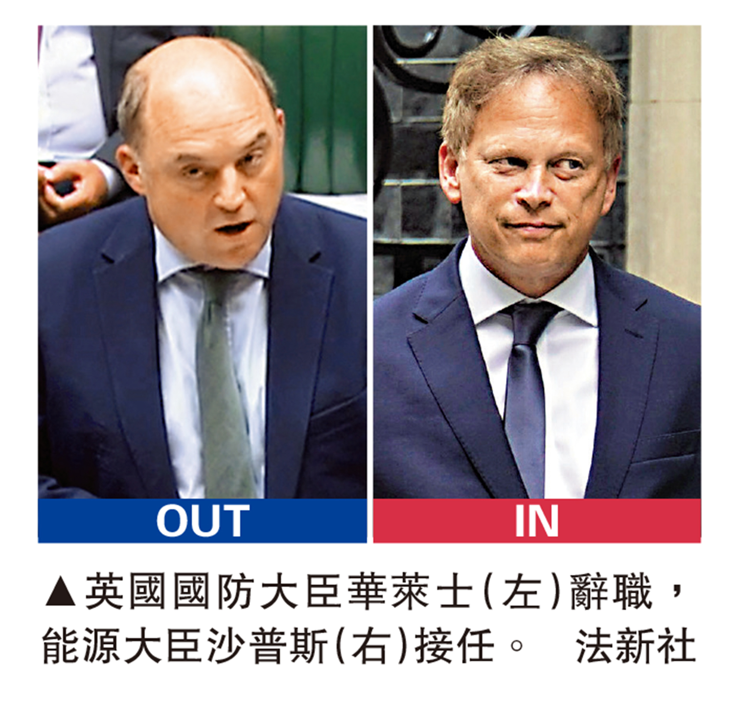 【大公報訊】綜合BBC、路透社報道:當地時間8月31日,英國國防大臣華萊士致信首相蘇納克辭去防相職務。蘇納克隨後任命能源大臣沙普斯出任國防大臣。沙普斯被視為蘇納克的親密盟友,隨着新一輪議會大選預計明年登場,蘇納克預計在近期進行人事改組,組成有利贏得大選的「戰鬥內閣」。
