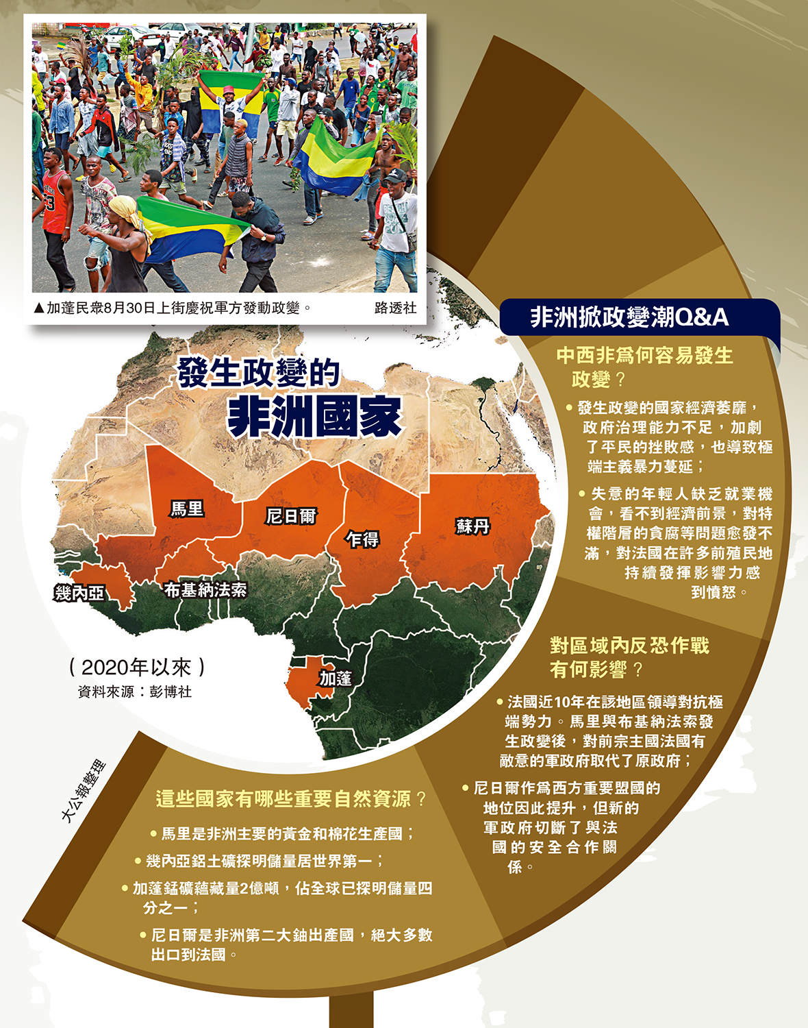 •法國近10年在該地區領導對抗極端勢力。馬里與布基納法索發生政變後,對前宗主國法國有敵意的軍政府取代了原政府;