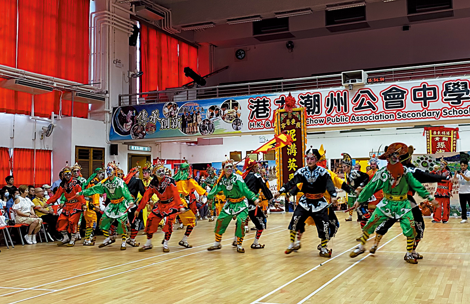 隨着鑼鼓響起,英歌舞表演開始,三十多名扮成古代英雄好漢的舞者排成兩行,每人左右手各持一根短木棒,上下左右不停對擊,踩着強烈節奏以剛勁舞姿橫向進場,氣勢雄壯,一下子令港九潮州公會中學大禮堂的氣氛陡然熾熱起來。這是廣東揭陽市「文化進校園活動(香港站)」的重頭戲,除了英歌舞,還有青獅表演、剪紙示範表演、潮劇表演等,都是國家級非物質文化遺產項目。在揭陽同鄉社團總會的支持下,揭陽市文化部門牽頭,一批非遺傳承人和表演團隊成員專程來到香港,本周一(八月二十八日)在旺角港九潮州公會中學與師生家長和在港揭陽鄉親進行交流。鄉音傳鄉情,家鄉的傳統文化,令人心往神馳。