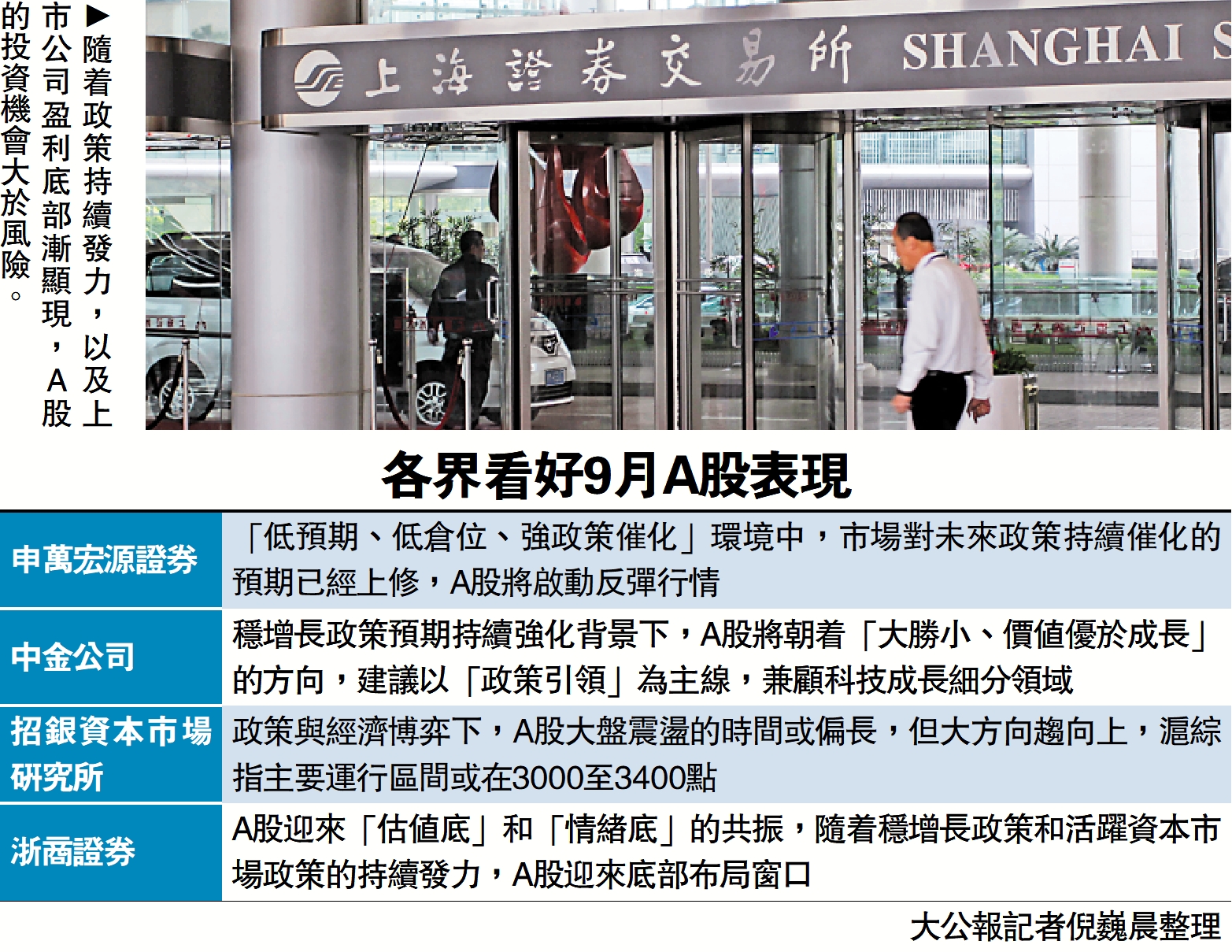 【大公報訊】記者倪巍晨上海報道:受股票印花稅減半,以及調降融資保證金比例、優化IPO和再融資節奏、進一步規範股份減持行為等利好政策帶動,A股市場情緒顯著提振,滬綜指及深成指上周五(1日)分別收報3133點及10463點,全周各漲2.26%和3.29%。分析稱,目前A股估值、投資者情緒和投資行為等均已呈現偏底部特徵,隨着政策持續發力背景下,加上內生增長動能的修復,上市公司盈利底部料漸顯現,A股當前位置的機會大於風險。