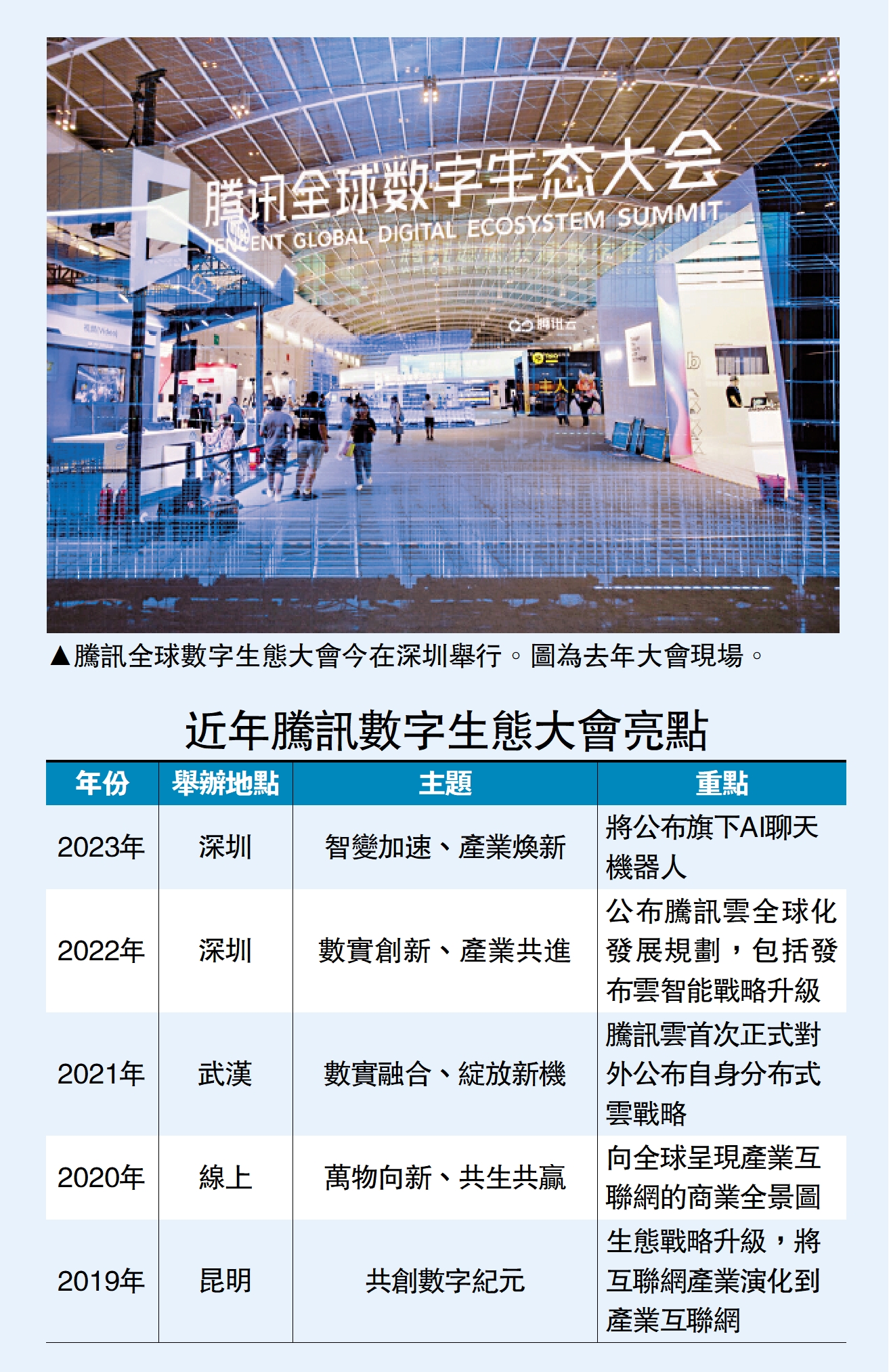 騰訊(00700)將於今天(7日)起一連兩天在深圳舉行「騰訊全球數字生態大會」,繼集團高管預告發布自家人工智能大模型「混元大模型」,旗下騰訊雲更預熱暗示將在會上發布AI聊天機器人。該大會主題為「智變加速·產業煥新」,由主峰會、40多個產品及行業分會場,將研討針對雲計算、大數據、人工智能、安全、SaaS等核心數字化工具發布關鍵進展,聯合生態夥伴推出最新行業場景解決方案。\大公報記者 李潔儀