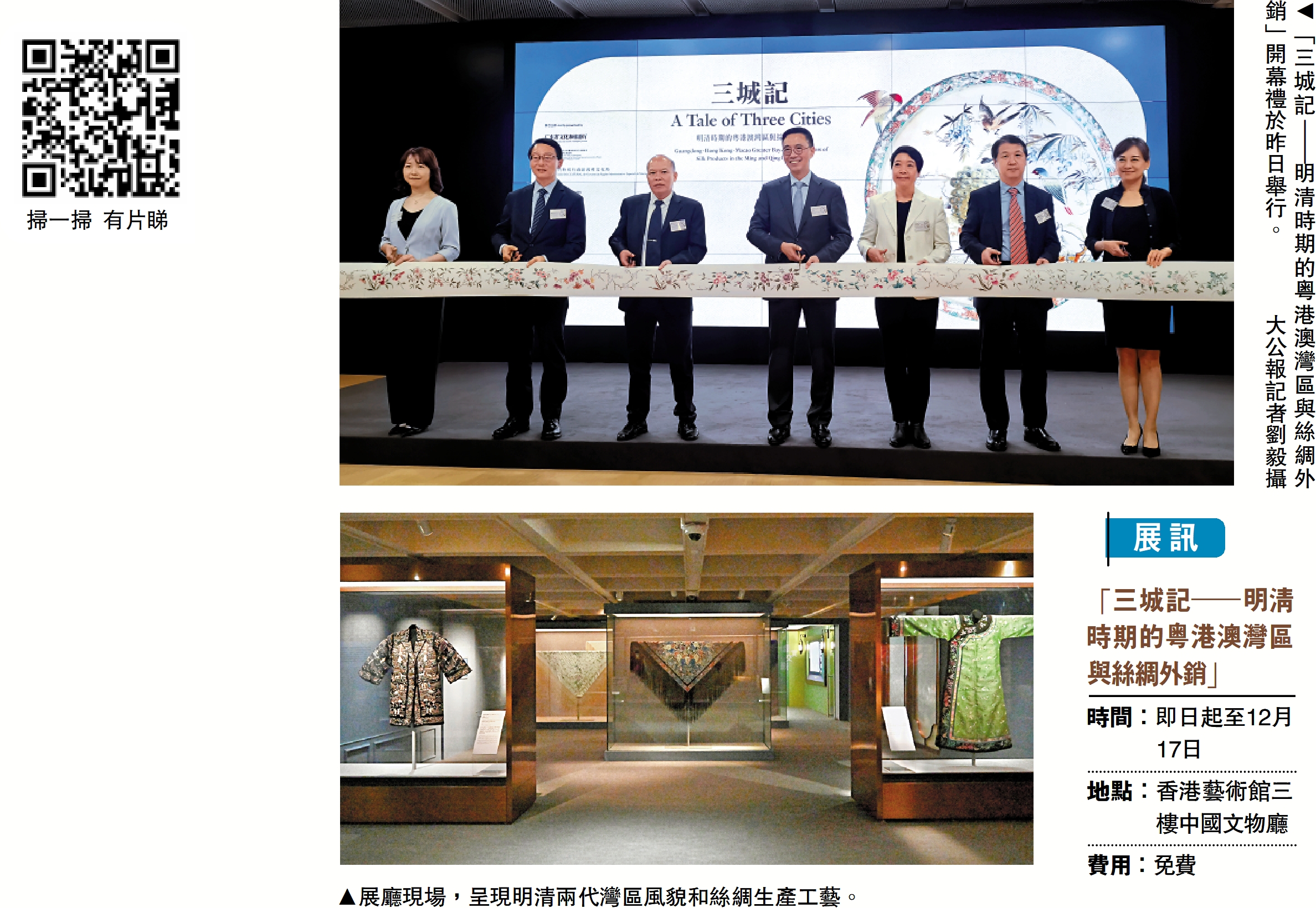 絲綢外銷見證昔日大灣區手工業輝煌。為展示香港、廣州、澳門三地如何通過海上絲綢之路進行中外文化交流,由廣東省博物館、澳門博物館和香港藝術館聯合籌劃的巡迴展覽「三城記─明清時期的粵港澳灣區與絲綢外銷」,即日起至12月17日在香港藝術館舉行,展覽匯聚三間博物館的108組藏品,呈現明清兩代灣區風貌和絲綢生產工藝。\大公報記者 顏 琨、劉 毅