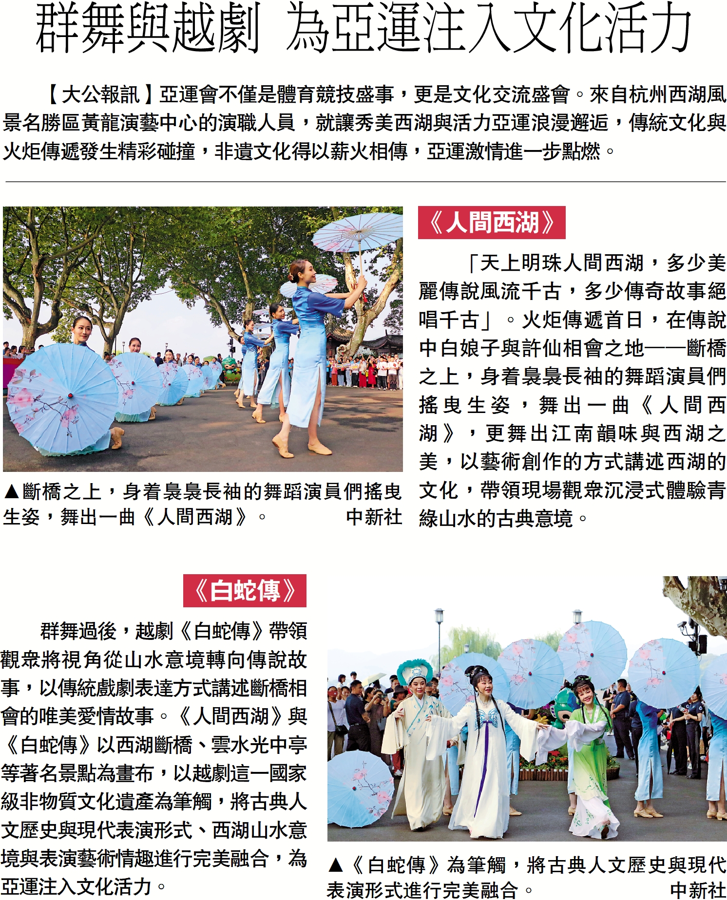 【大公報訊】亞運會不僅是體育競技盛事,更是文化交流盛會。來自杭州西湖風景名勝區黃龍演藝中心的演職人員,就讓秀美西湖與活力亞運浪漫邂逅,傳統文化與火炬傳遞發生精彩碰撞,非遺文化得以薪火相傳,亞運激情進一步點燃。