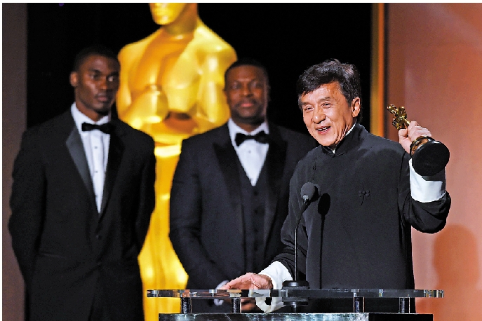 2016年,62歲的成龍獲頒發「終身成就獎」,創造華人歷史。當年成龍身穿一身黑色中國長衫上台領獎,他說:「這是一個夢想。我在電影行業幹了56年,拍了超過200部電影,摔斷了很多根骨頭,終於這個獎是我的了……23年前,我在史泰龍(Sylvester Stallone)家中首次摸到了奧斯卡獎盃,我摸了,親了,還聞了,我感覺那座獎盃上還留有我的指紋。當時我告訴自己,我真的也想要一座奧斯卡獎盃……我感謝香港這座城市,也感謝自己的祖國中國,為自己是中國人感到自豪。」