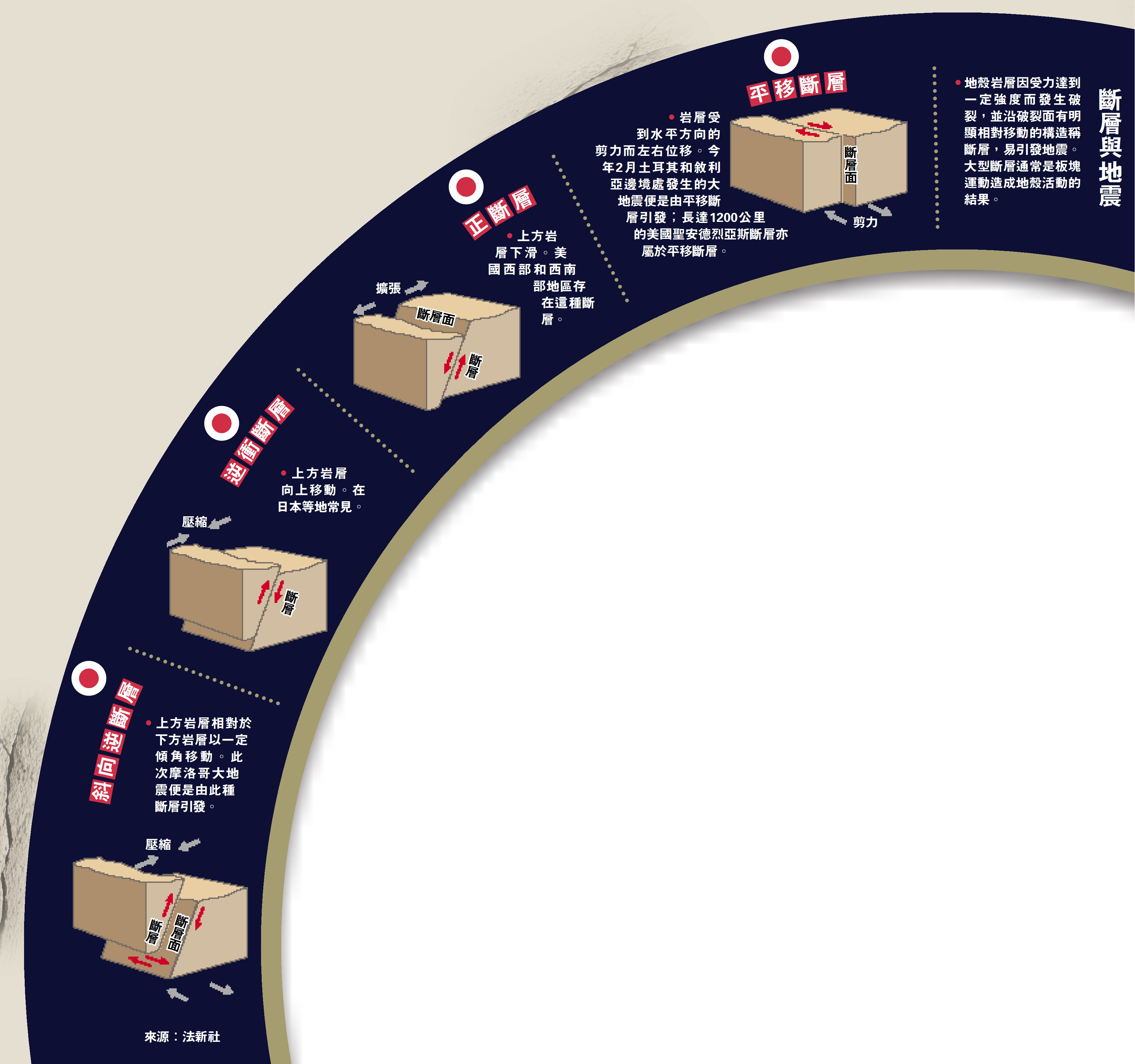 •岩層受到水平方向的剪力而左右位移。今年2月土耳其和敘利亞邊境處發生的大地震便是由平移斷層引發;長達1200公里的美國聖安德烈亞斯斷層亦屬於平移斷層。