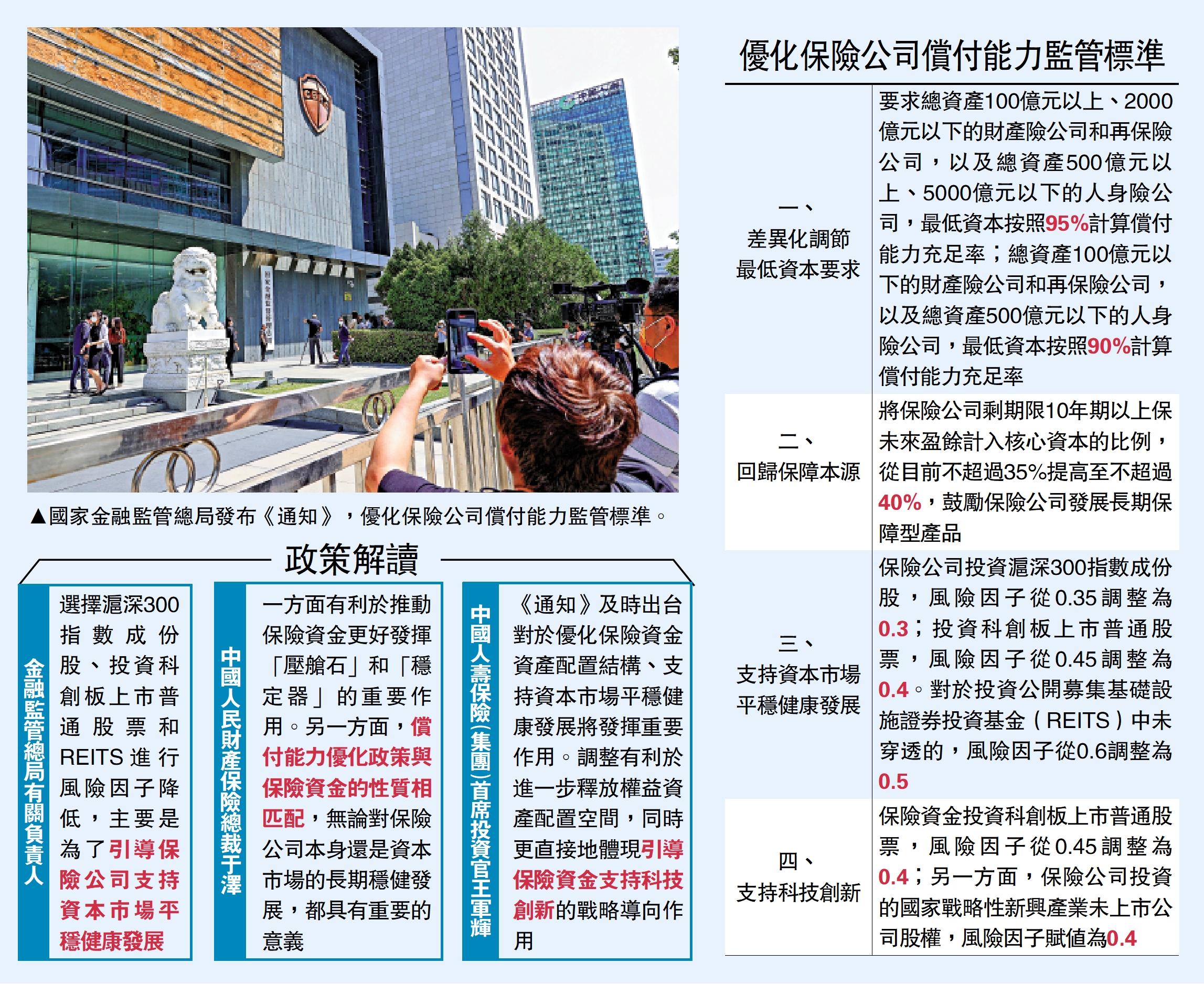 金融監管總局有關部門負責人向內媒表示,此次《通知》之所以選擇滬深300指數成份股、投資科創板上市普通股票和REITS進行風險因子降低,主要是為了引導保險公司支持資本市場平穩健康發展。保險業人士指出,滬深300代表了市場裏的藍籌股,以經濟結構轉型為主,對這個領域風險因子的降低,體現了監管引導險資長期投資、價值投資的理念。