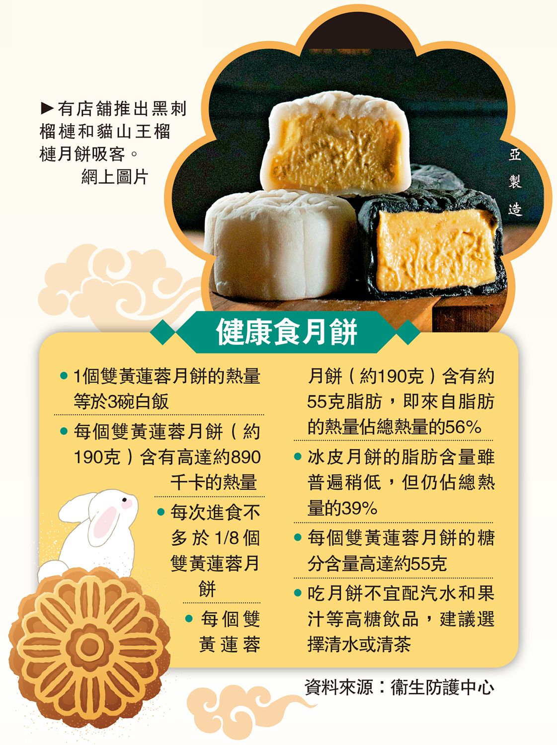•每個雙黃蓮蓉月餅(約190克)含有高達約890千卡的熱量