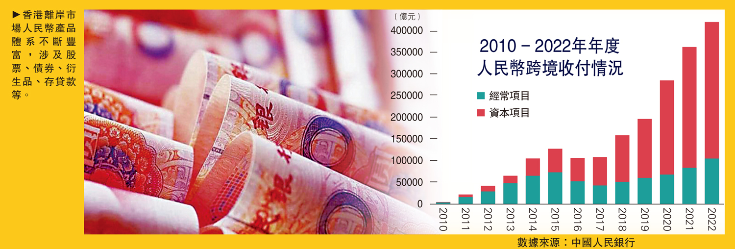 事實上,為把握人民幣國際化機遇,香港近年也在積極推動相關工作。其中今年6月推出「港幣─人民幣雙櫃台模式」,目前有24家公司股票同時以港元和人民幣交易,這些公司的成交量佔港股平均每日成交量約四成。