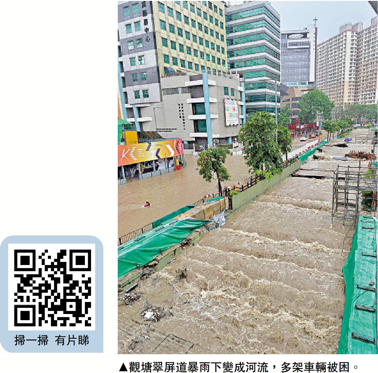 本港經歷了世紀暴雨後,部分地區仍暴雨持續,天文台昨日發出局部地區大雨提示,其中西貢區更在1小時錄得超過100毫米雨量,觀塘亦錄得每小時46毫米雨量,九龍東多處水浸。渠務署指全港昨早共有8處地方水浸,因大雨令落葉及垃圾淤塞渠口導致局部積水,署方派出了15隊應急隊處理水浸,中午過後大部分巡查及清理工作已完成。