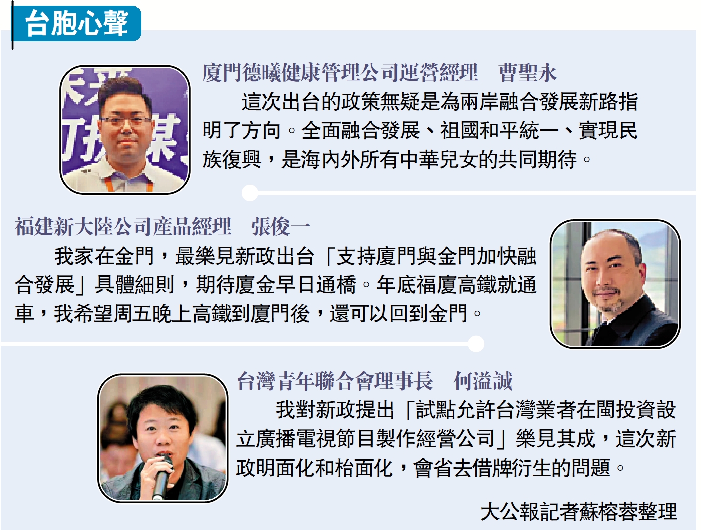 這次出台的政策無疑是為兩岸融合發展新路指明了方向。全面融合發展、祖國和平統一、實現民族復興,是海內外所有中華兒女的共同期待。