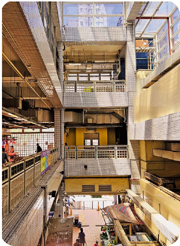 由西向東行,越來越熱鬧。整條正街人山人海,一道步行連橋凌空斜穿,串聯起分立街道兩邊的西營盤街市和正街街市,簡單的立面塗料和裸露的結構構件無不體現出現代主義建築高效和有序的特點,略加些亮橘紅色的樓梯和平台和碧藍的天空遙相呼應,一幅亞熱帶繁忙市井生活的圖景就一覽無餘。走進街市內部,周邊的世界反倒安靜下來,蔬菜檔、魚檔和肉檔等有序地排列着,還有街市辦公區域,多層的建築空間由一個大中庭組織在一起,抬頭向上,屋頂的天窗柔和地灑下日光,本應吵嚷繁雜的街市竟安靜得有了神聖之感。零零散散的檔口像是在訴說傳統街市的式微,穿行於其間,不禁有些出神,我們今天不以為然的日常會不會正是未來彌足珍貴的歷史?