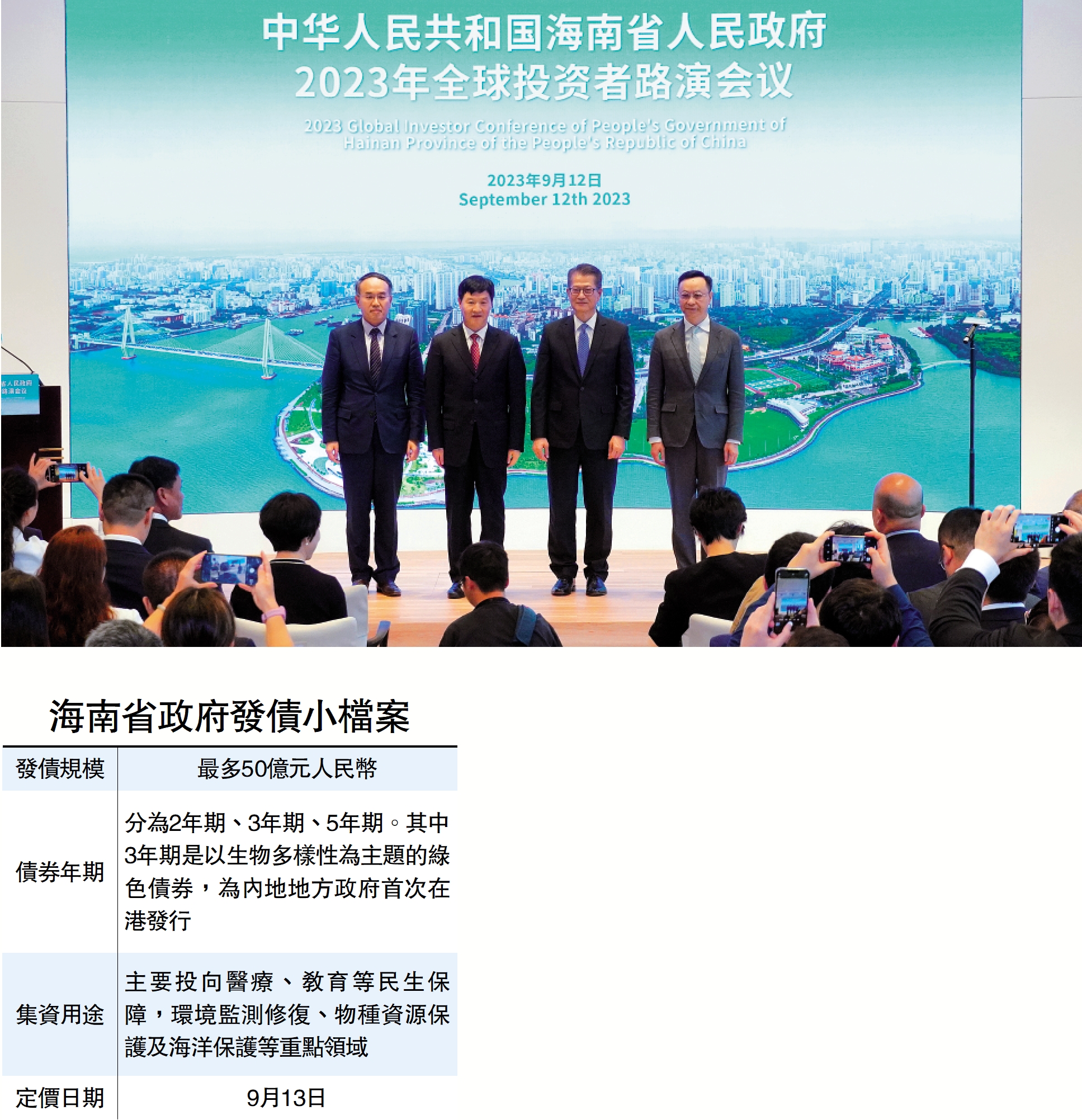 海南省人民政府繼去年10月在香港發行離岸人民幣地方政府債券後,再次來港發債,今次發債包括以生物多樣性為主題的綠色債券。發行債券類型為高級無抵押固定利息債券,規模不超過50億元(人民幣,下同),擬發行期限為2年、3年和5年,募集資金將投向醫療、教育、環境資源保護等領域。
