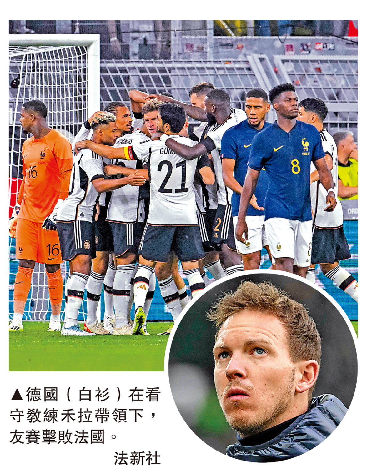 德國日前發生近百年來首次出現主動辭退主帥,教練費力克被炒,由總監禾拉兼任看守主帥下,周三在熱身賽主場將士用命下以2:1擊敗法國。雖然終止連敗,但換帥才是當務之急,據聞德國有意向前拜仁慕尼黑主帥拿高士文(圓圖)埋手,這名36歲少帥目前雖然賦閒在家較易挖角,但拿高士文與費力克同屬過於着重戰術體系的主帥,德國此舉隨時重蹈覆轍。