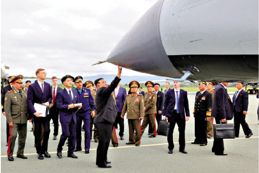 當天早上,金正恩抵達距海參崴約50公里遠的克涅維基機場,參觀俄羅斯太空軍現代化裝備,紹伊古到場迎接。紹伊古向金正恩展示能夠攜帶核武的戰略轟炸機圖-160、圖-95和圖-22M3,這些都是俄羅斯空中核打擊力量的重要組成部分。紹伊古在談到一架戰機時,告訴金正恩說:「它可以從莫斯科飛到日本,然後再折返。」