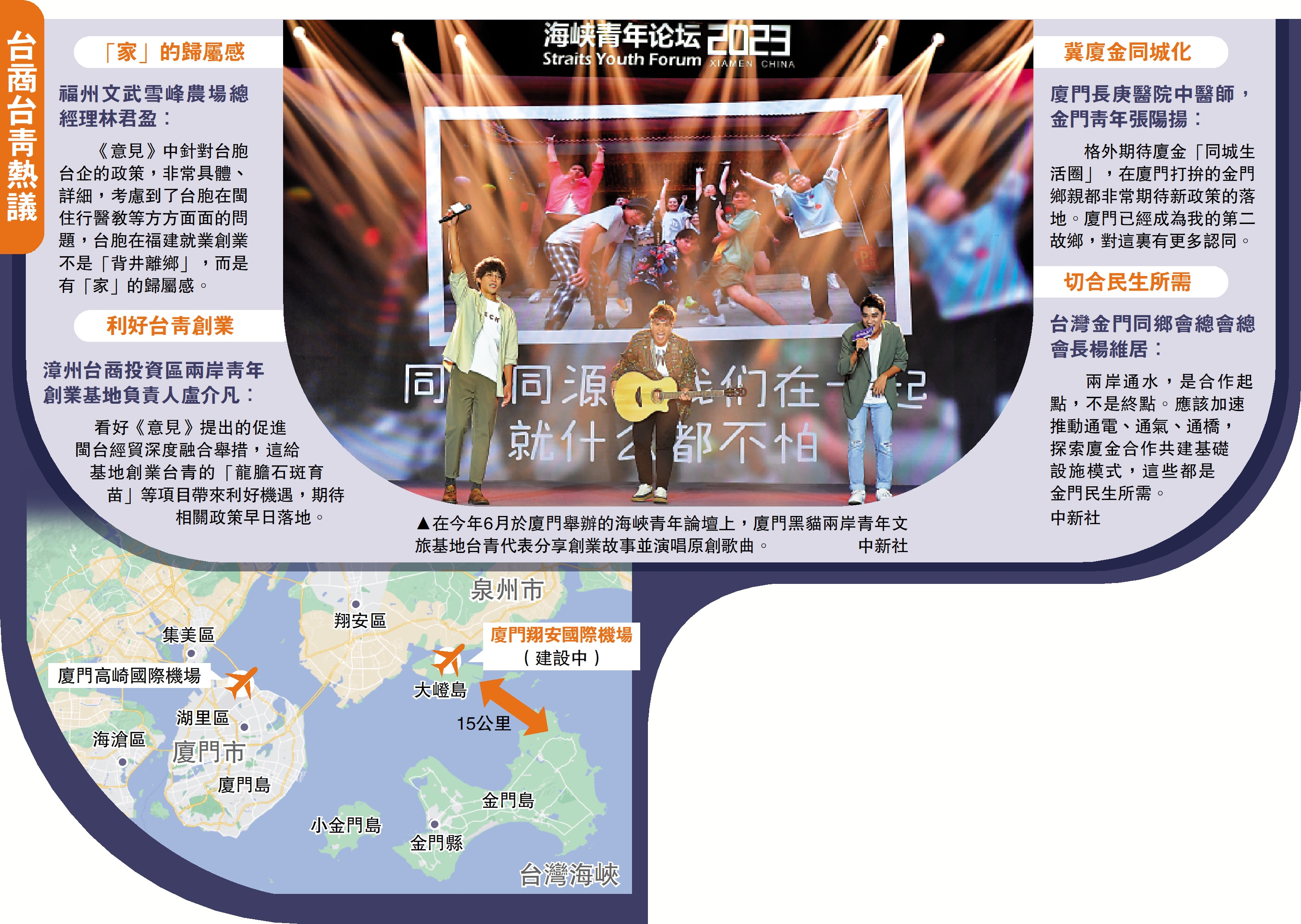【大公報訊】中共中央、國務院《關於支持福建探索海峽兩岸融合發展新路 建設兩岸融合發展示範區的意見》(下稱《意見》)日前發布,隨即引發熱烈反響。島內輿論認為,《意見》善意回應台灣民意的訴求,將廈金、福馬「一日生活圈」納入官方論述,在金門、馬祖有相當堅實的民意基礎。按照規劃,未來金馬地區各項硬體建設勢必升級,成為兩岸交通與貨運的新樞紐。而對於《意見》提出「共用廈門新機場」,金門縣長陳福海回應,願意協助開展事務性協商工作。