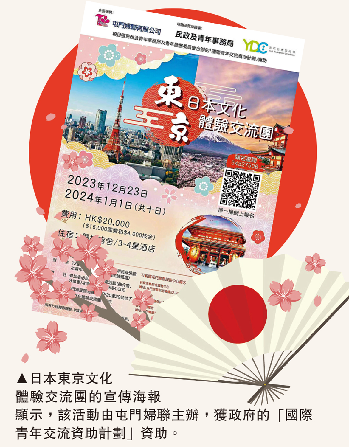 有學生向《大公報》報料,指9月18日當天收到關於日本東京文化體驗交流團的宣傳海報,海報顯示活動為期10天(2023年12月23日至2024年1月1日),費用兩萬元,分別包括1.6萬元團費及4000元按金,參加者須出席簡介會、分享會等所有活動才會發還全部按金。海報顯示,交流團由屯門婦聯主辦,獲政府的「國際青年交流資助計劃」資助。讀者陳先生認為,日本上月把核污水排海,特區政府亦禁止10個都縣的日本水產進口,這個時候,政府是否適合高調資助日本文化體驗團?