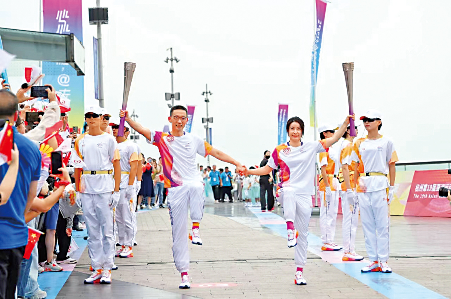杭州亞運公益圓夢大使、前國家隊跳水運動員、奧運冠軍、被譽為「跳水女皇」的郭晶晶,接過施一公手中的火炬,成為第3棒火炬手。兩人還精心設計了「金雞獨立」的單腳站立姿勢交接棒,引起現場觀眾的一片歡呼。不少觀眾還一路跟隨郭晶晶傳遞線路追拍。