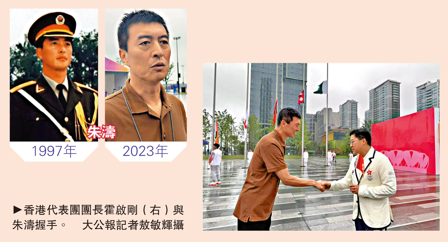 區旗緩緩升起,朱濤和一眾港隊成員一起唱起國歌,升旗儀式結束後,朱濤來到香港代表團中間,與部分團員交流。香港代表團團長霍啟剛見到朱濤,與他親切握手,並對他到現場協助升旗儀式表示感謝。