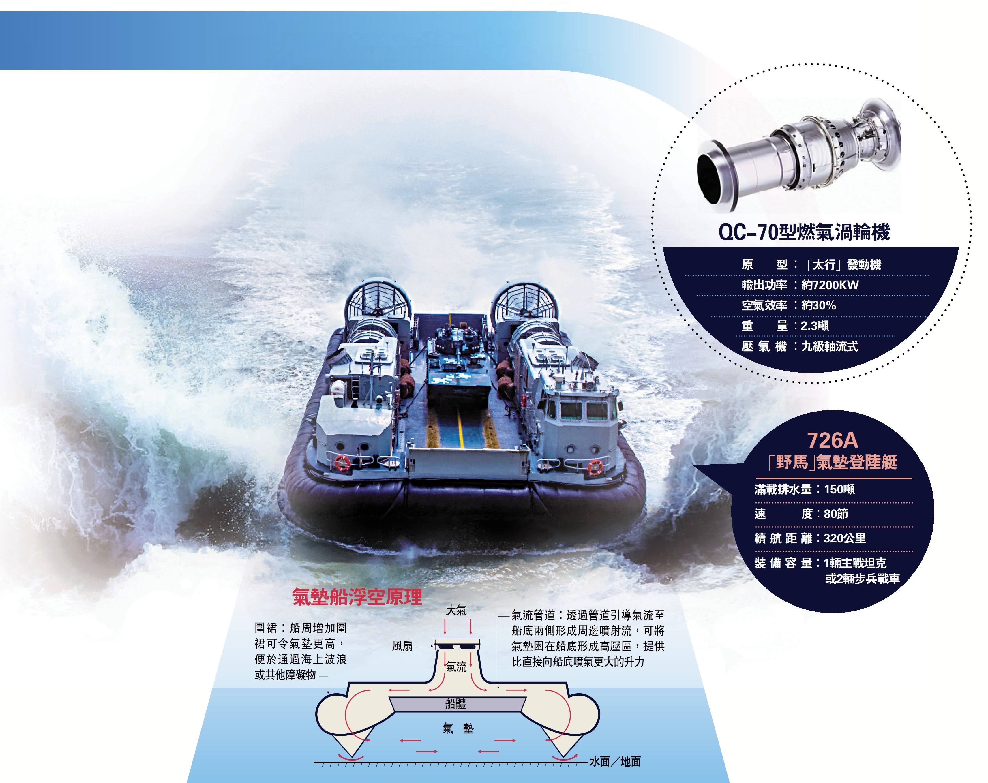 在國產「太行」發動機基礎上改裝的新型燃氣渦輪機,已經裝備在726A型「野馬」氣墊登陸艇,解決了國產氣墊艇缺乏自主發動機的困境,且重量減輕約四分之一,並改善了噪音大等缺點。「野馬」可以將坦克、裝甲戰車高速運送上岸,被譽為「掠海突擊利刃」,是兩棲攻擊艦和船塢登陸艦的標配裝備。\馬浩亮(文)