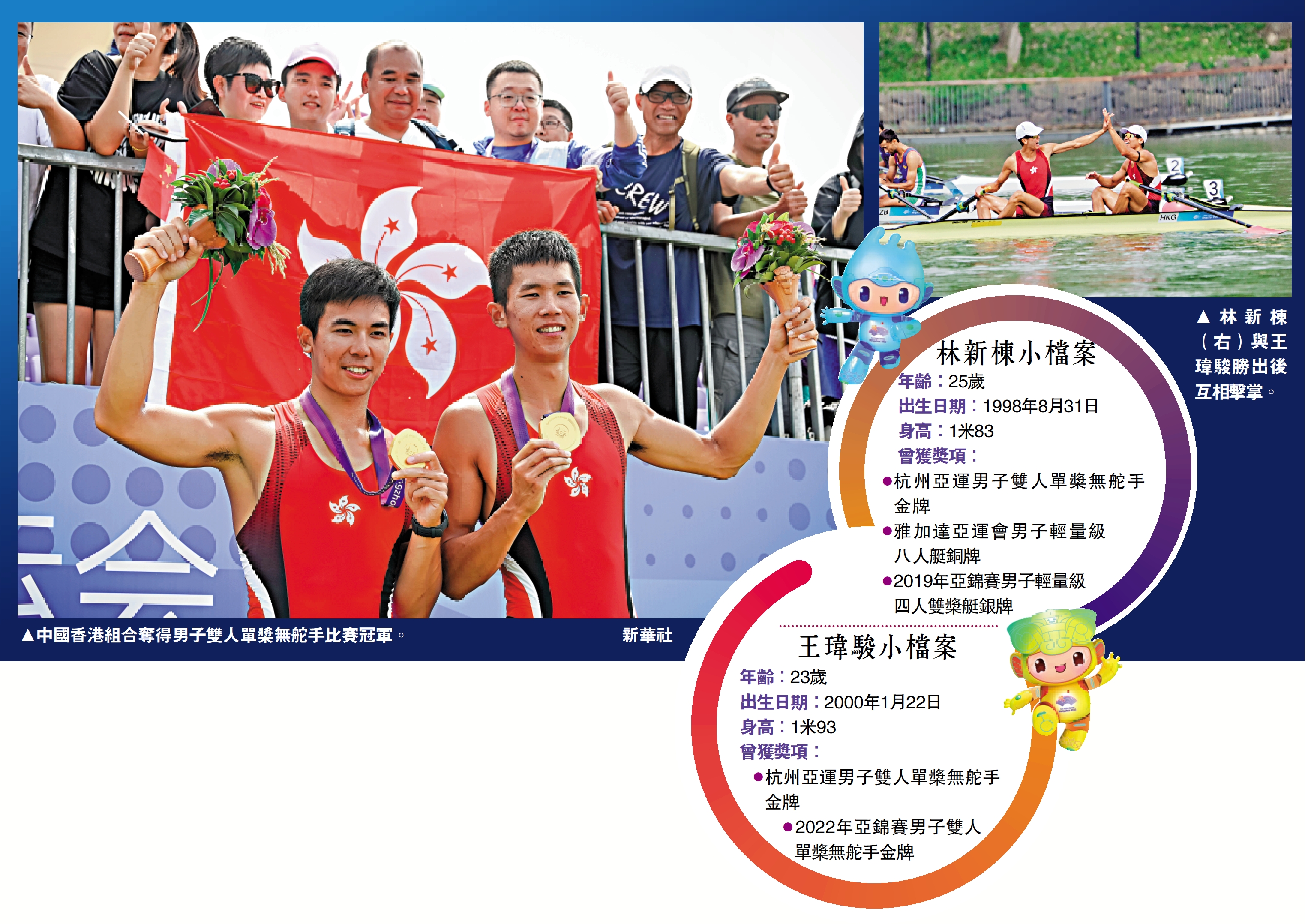 24日上午,杭州亞運會賽艇男子雙人單槳無舵手決賽中,林新棟/王瑋駿為香港摘得本屆亞運會首枚金牌,這也是繼2014年仁川亞運會香港賽艇歷史首次奪得亞運會金牌後,時隔9年再度站上亞運會最高領獎台。在頒獎儀式上,林新棟多次擦拭眼淚,難掩激動之情。他們表示,過去幾年付出了艱辛的努力,如今圓夢便覺得一切的付出都值得。他又提到,比賽中聽到普通話、粵語的加油助威聲,感受到主場作戰的氛圍,讓他增添信心和力量。