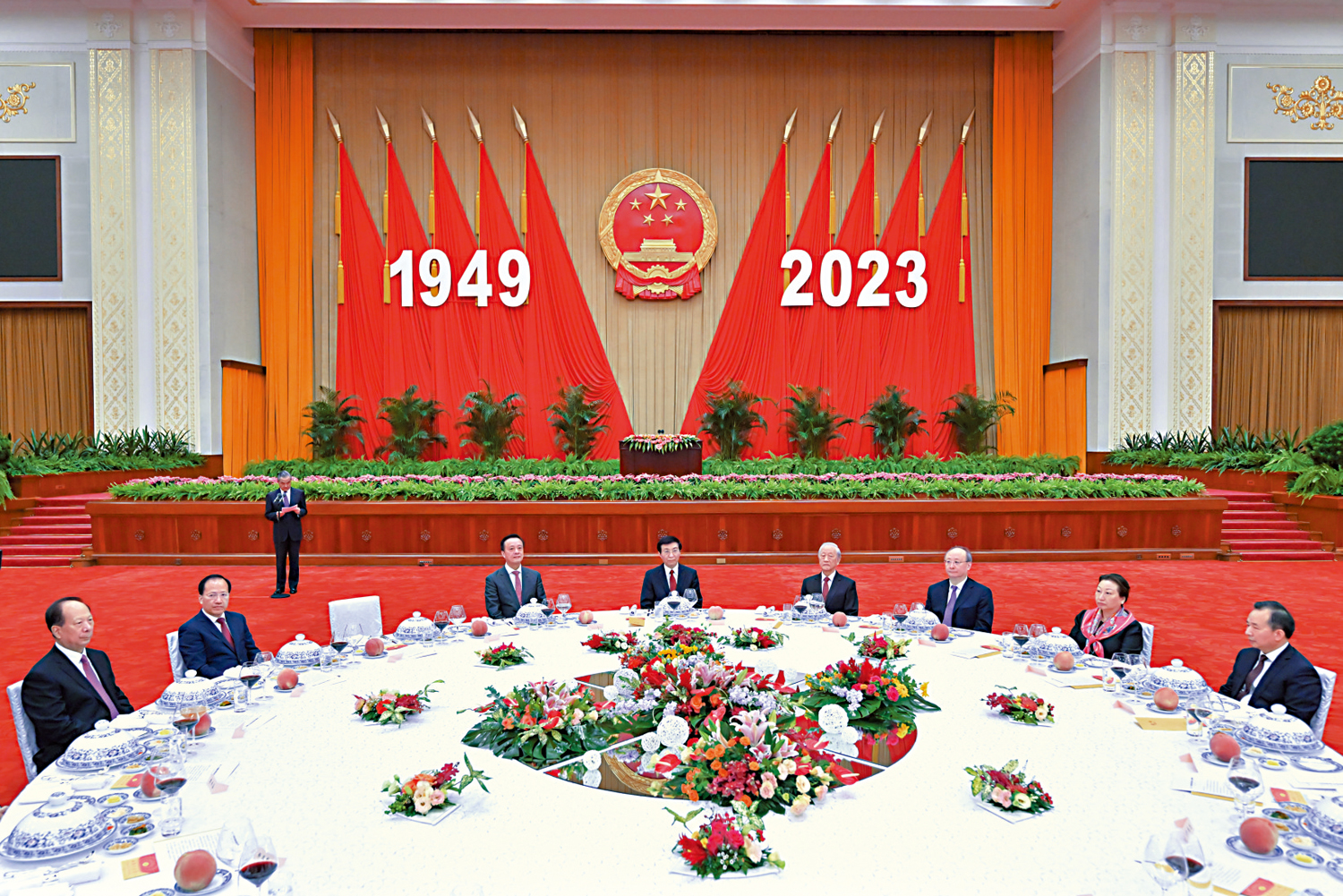 【大公報訊】據新華社報道:全國政協辦公廳、中共中央統戰部、國務院僑辦、國務院港澳辦、國務院台辦、中國僑聯25日在人民大會堂聯合舉行國慶招待會,慶祝中華人民共和國成立74周年。中共中央政治局常委、全國政協主席王滬寧出席並致辭。他表示,要堅持以習近平新時代中國特色社會主義思想為指導,牢牢把握團結奮鬥的時代要求,鞏固和發展最廣泛的愛國統一戰線,團結一心,踔厲奮發,勇毅前行,全面建設社會主義現代化國家,以中國式現代化全面推進中華民族偉大復興。