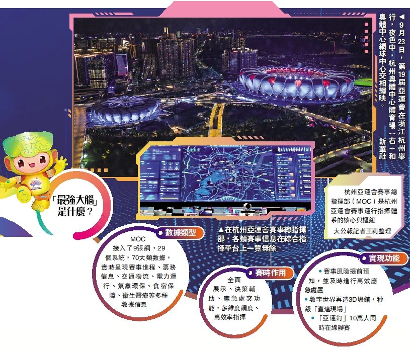 杭州亞運會成為亞運史上規模最大、項目最多的一屆亞運會,也讓賽事指揮調度面臨了不小挑戰。科技辦亞運,此次杭州亞運充分運用智能物聯、VR全景、數字孿生等「黑科技」組建而成的賽事總指揮部(MOC),成為杭州亞運會的「最強大腦」,在賽時發揮全面展示、決策輔助、應急處突功能。大到辦賽城市的整體概況,小到在56個競賽場館正在舉行的每場賽事,指揮平台快速調度,一秒盡收眼底,甚至還能獲知潛在風險、高效應急處置。「賽事總指揮部像『智慧大腦』,各個競賽場館相當於各個器官,器官運行是否正常,由大腦來統一掌握。」MOC綜合指揮平台承建方、海康威視亞運保障工程師張洋介紹。/大公報記者 王莉