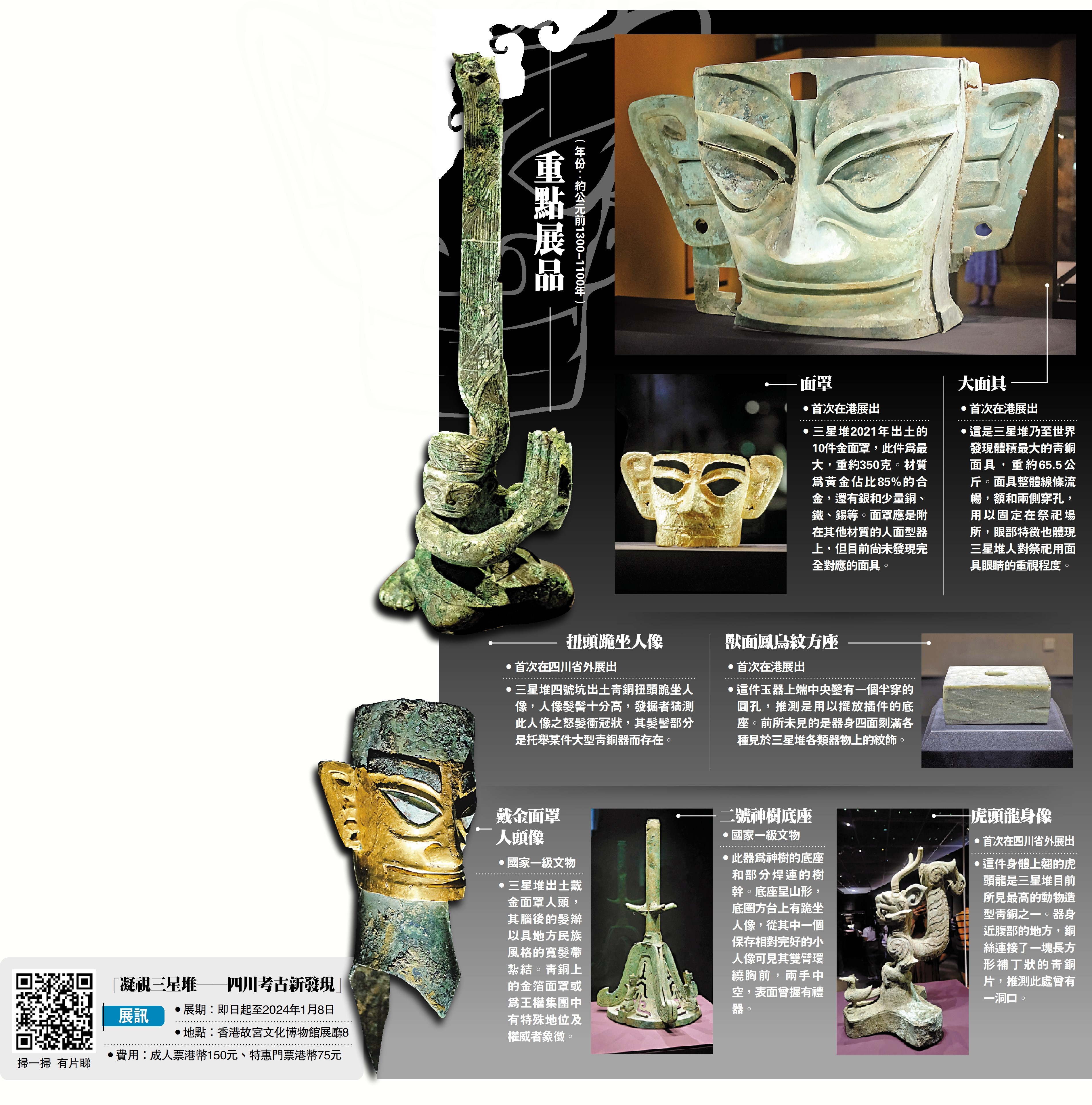 香港故宮文化博物館特別展覽「凝視三星堆——四川考古新發現」今日開展,展覽聚焦三星堆遺址為代表的四川地區考古新發現,展出120件距今2600年至4500年的青銅器、玉器、金器等文物,包括於三星堆發現的世界現存體積最大的青銅面具,以及近年三星堆考古新發現之戴尖脊帽立人像等。由於預計「十一」黃金周長假將有大批遊客前往參觀,香港故宮於10月3日原定的休館日將繼續對外開放。\大公報記者 劉 毅、顏 琨(文) 蔡文豪(圖)