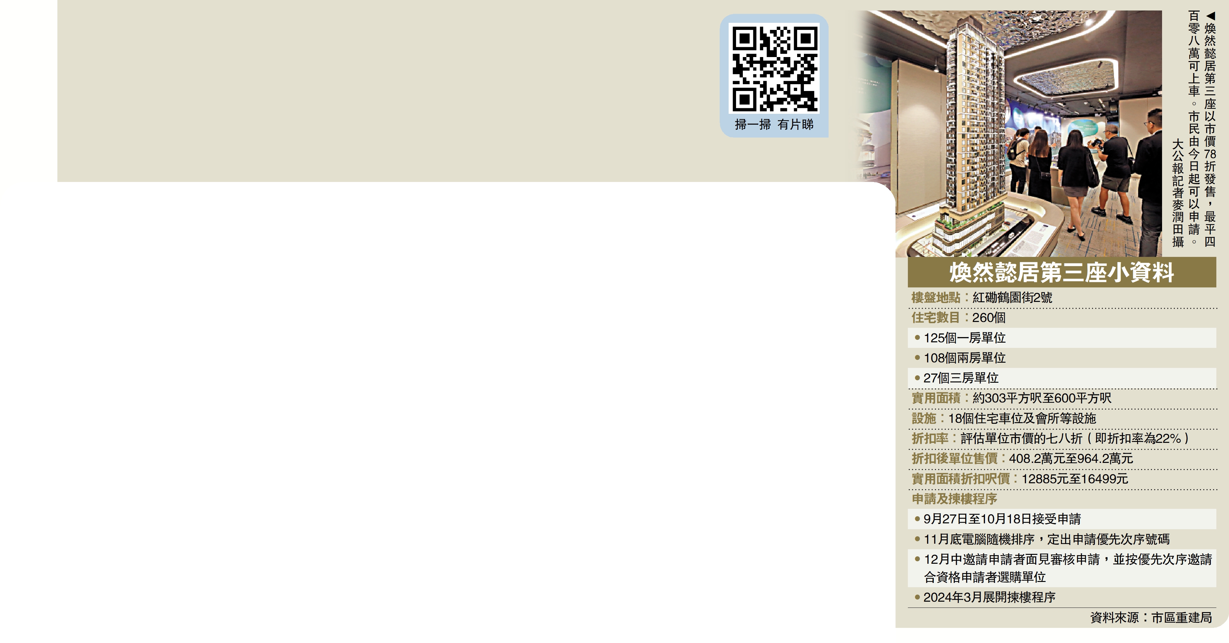 市建局表示,該折扣率是因應政府就首置項目折扣的框架設定,需較最近一期居屋的62折減少10至20個百分點,同時項目近市中心,15分鐘步程範圍內涵蓋三個港鐵站,建築頂層亦設有住客會所,認為項目價格和質素有一定競爭力。\大公報記者 王亞毛