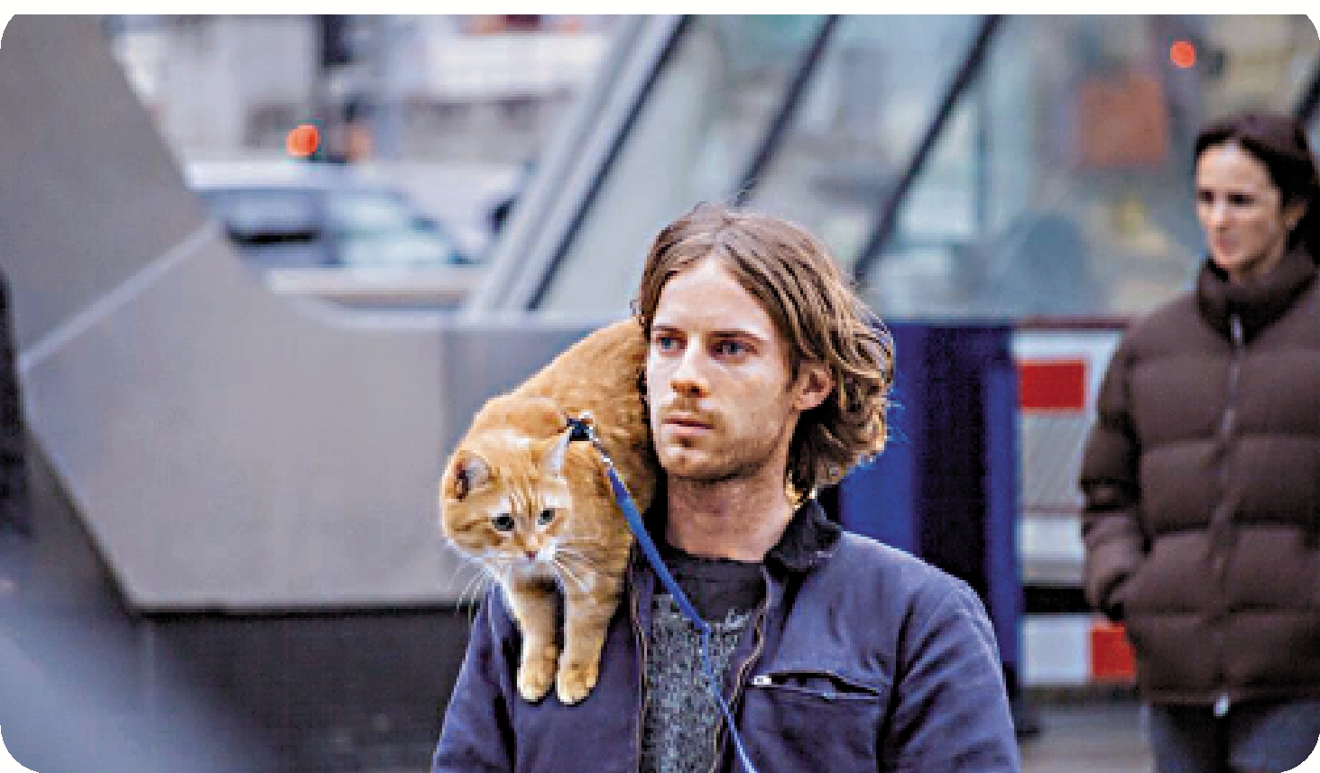 直到二○○七年春天,一隻流浪貓的出現,徹底改變了鮑文的命運。他在回憶錄中寫道,那是一隻受傷的薑黃色小貓,蜷縮在公寓的走廊裏,作為一個勉強度日的流浪藝人,他從未想過擁有一隻寵物。出於憐憫,他花錢給小貓治病,精心照顧牠,幫助牠恢復健康,然後將牠放回街頭,準備就此分別。但小貓卻鐵了心地留在他的身邊,還陪他一起去街頭賣藝。最後他決定收留這隻聰明的小貓,並依據自己最喜歡的美劇《迷離劫》(Twin Peaks)裏的殺手鮑勃一角給小貓起名鮑勃。在接下來的一年多的時間,鮑文和鮑勃這對人貓組合逐漸在歐美走紅,有人專程到他們慣常賣藝的地方打卡追星。鮑文也重獲新生,不僅與母親和好,也成功戒毒,更把自己的故事寫成書,甚至還買了第一所屬於自己的房子,並帶上鮑勃全球巡演,成了妥妥的人生贏家。