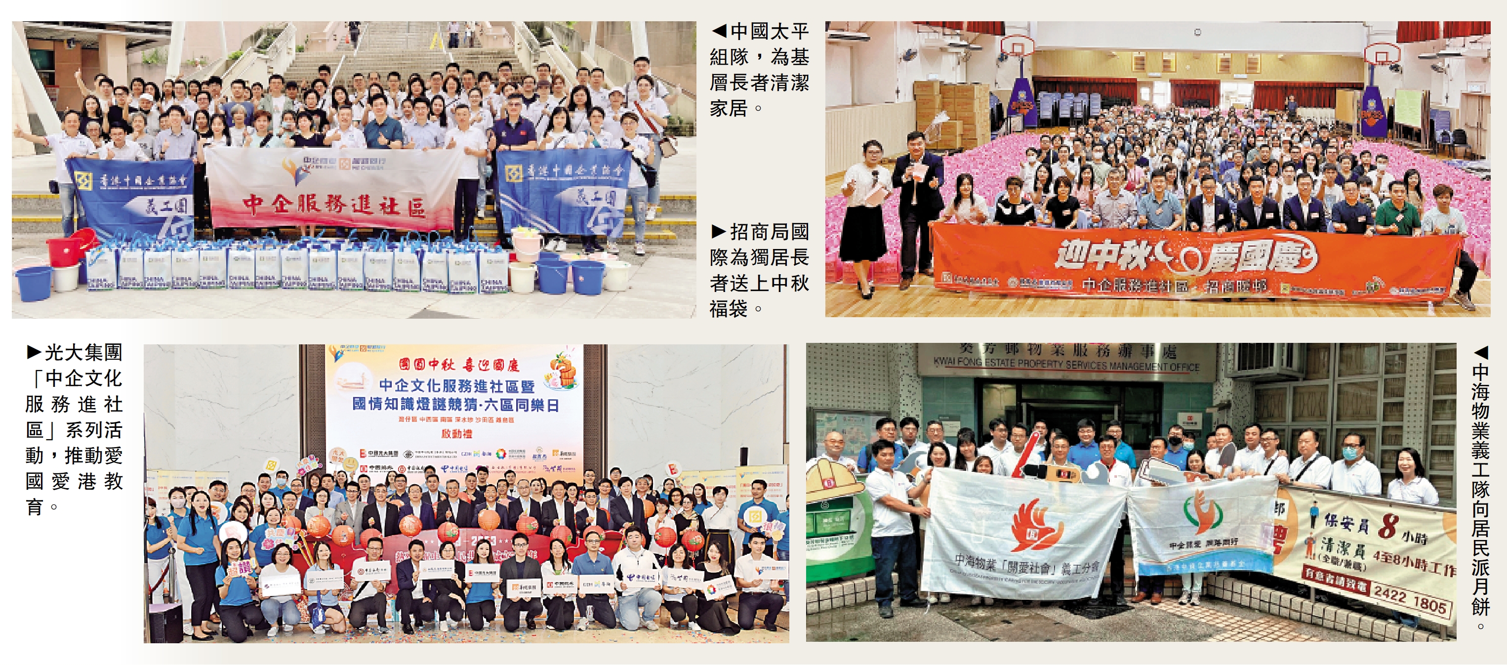 圖左上:中國太平組隊,為基層長者清潔家居。圖左下:光大集團「中企文化服務進社區」系列活動,推動愛國愛港教育。圖右上:招商局國際為獨居長者送上中秋福袋。圖右下:中海物業義工隊向居民派月餅。