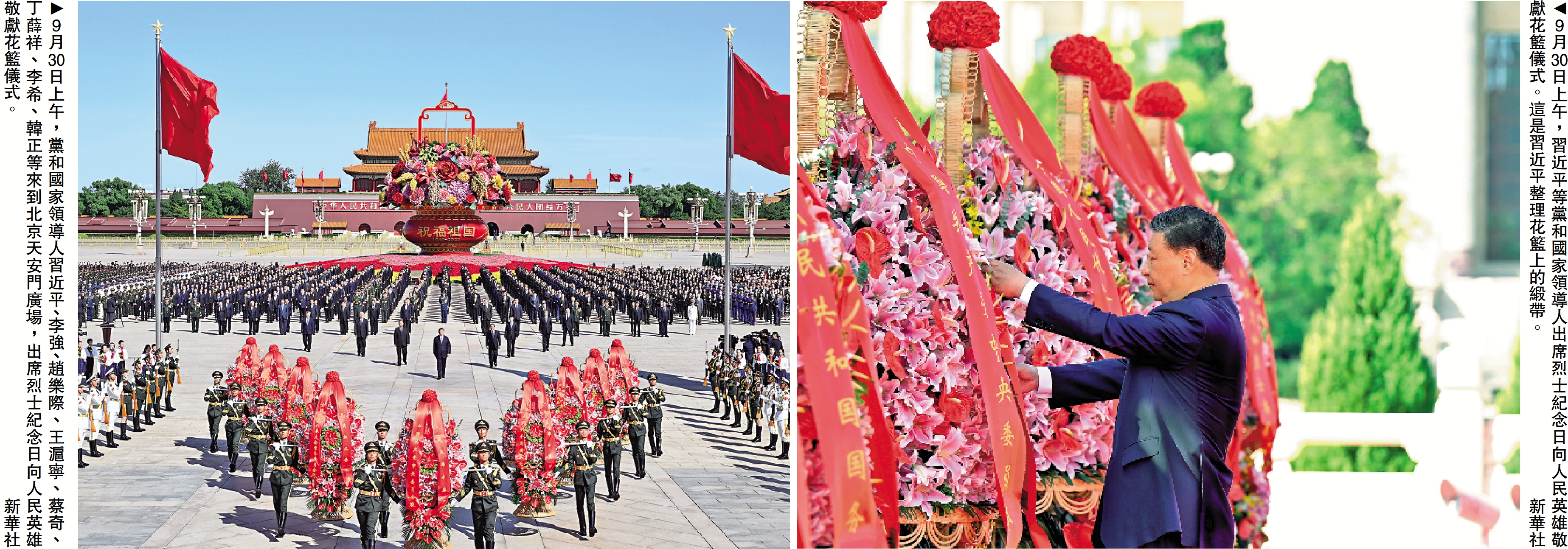 方陣前,以中共中央,全國人大常委會,國務院,全國政協,中央軍委,各民主黨派、全國工商聯和無黨派愛國人士,各人民團體和各界群眾,老戰士、老同志和烈士親屬,中國少年先鋒隊名義敬獻的9個大型花籃一字排開,花籃紅色緞帶上書寫的「人民英雄永垂不朽」格外醒目。