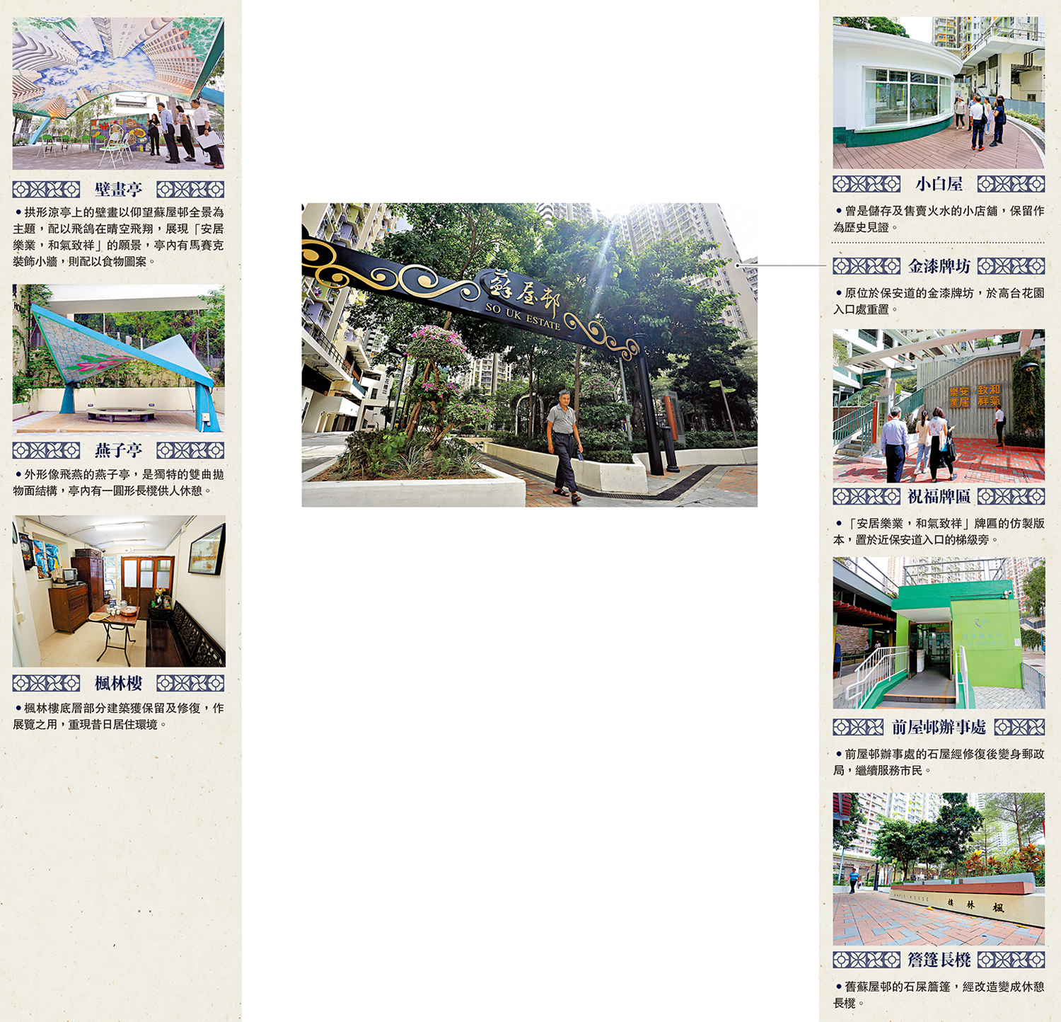 某一個下午的蘇屋邨,小朋友在小白屋前的花園嬉戲,居民在壁畫亭、燕子亭下乘涼,不少邨外人慕名而來,在寫着「蘇屋邨」的金漆牌坊前打卡;還有已遷走的「舊蘇屋人」重回故地,在邨內的文物徑漫步,回味當年,碰上投緣的「新蘇屋人」,一起暢談蘇屋邨新舊故事。這些生活日常,是另一種活化,把無形的「蘇屋邨文化」保存下來,濃濃的屋邨情味在重建後得以延續。