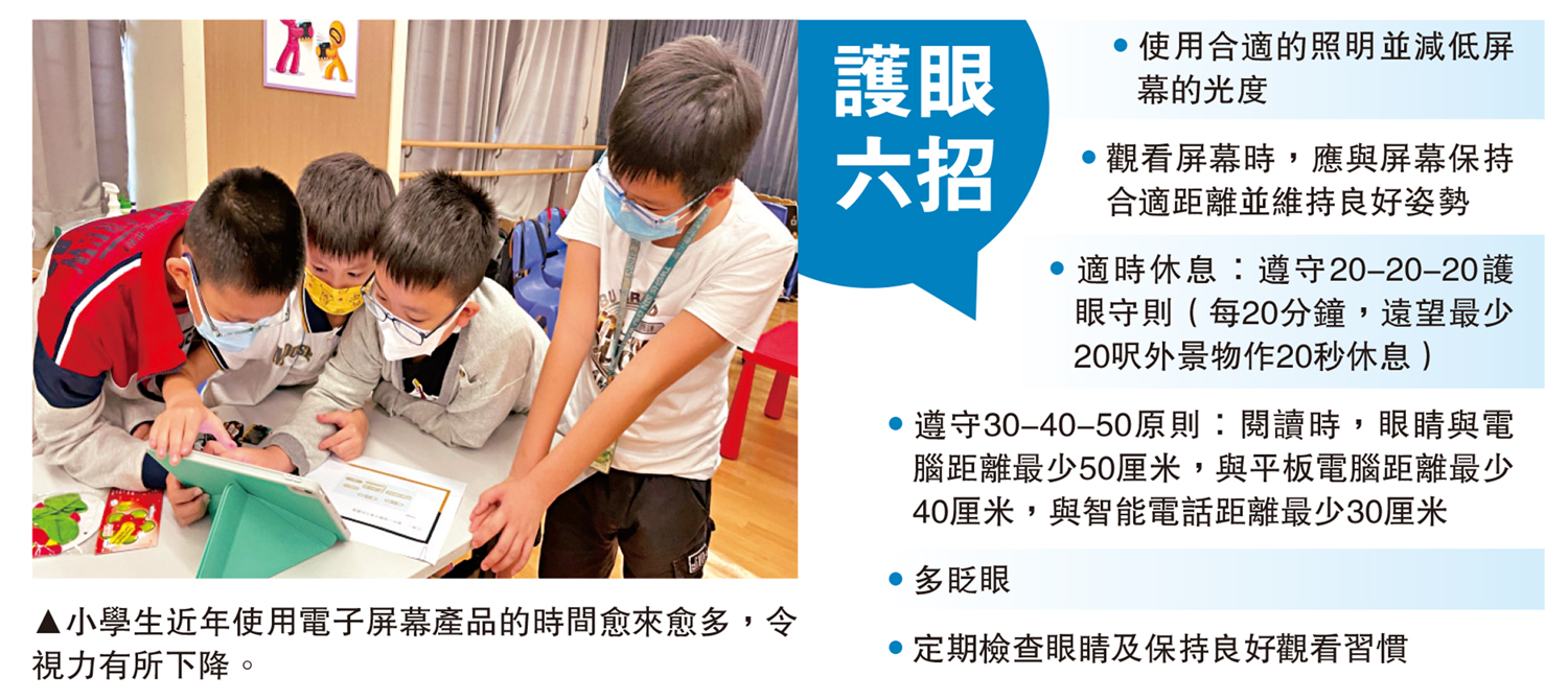 衞生署提醒學生在使用電子屏幕產品時,須注意保護視力。