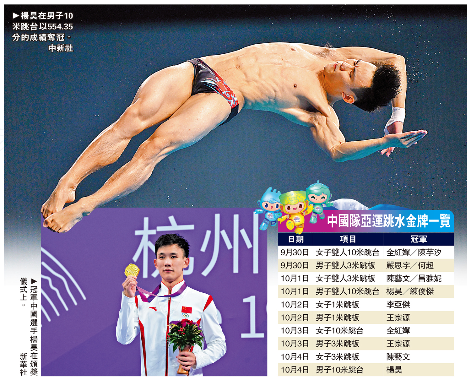 【大公報訊】亞運會跳水項目昨天迎來收官日,有「夢之隊」之稱的國家隊跳水隊力爭再度以「十全十美」完成賽事,延續參加亞運會從未失金的榮譽。結果楊昊與陳藝文不負眾望分別贏得男子10米跳台及女子3米跳板金牌,國家隊再次盡攬10面金牌完成賽事,其中6項個人賽更是包攬金、銀牌,得以保持於亞運會的完美金牌紀錄。