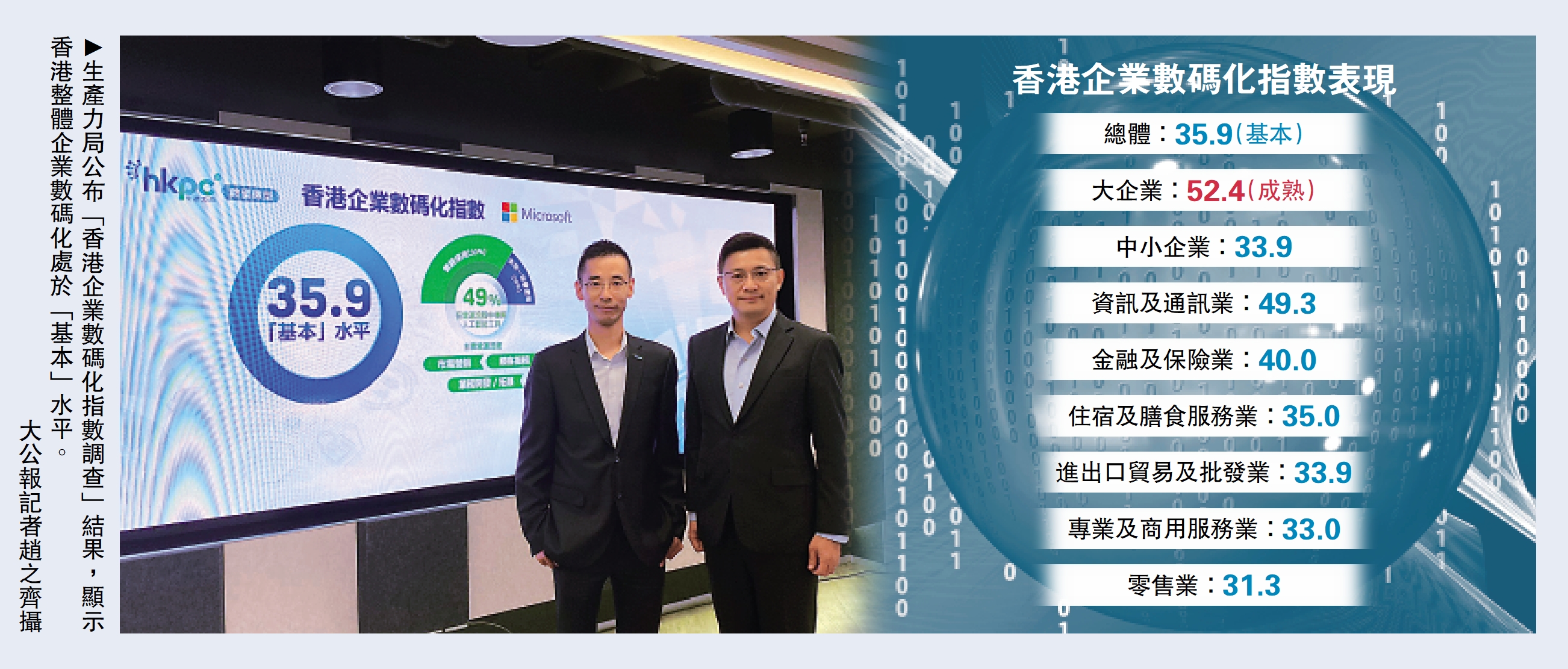 香港生產力促進局(生產力局)昨日公布「香港企業數碼化指數調查」結果,顯示香港整體企業數碼化處於「基本」水平,香港企業意識到數碼化的重要性並於個別營運流程開始使用數碼科技,其中以資訊及通訊業表現較理想,但數碼化仍處於起步階段,阻礙企業數碼轉型的最大原因是企業傾向維持現狀及資金缺乏。