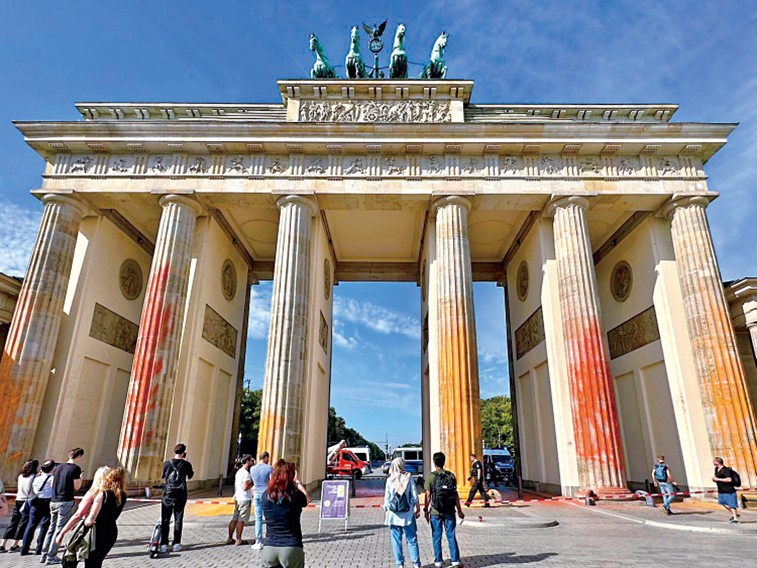 九月十七日一早,便看到手機群裏熱火朝天地在圖文並茂地「直播」勃蘭登堡門被潑油漆的實況。我剛剛跑步還路過了勃蘭登堡門,那時候還好好的,只有零零星星的遊客在拍照。誰知道不到半小時後,勃蘭登堡門便變了個樣兒。於是,忍不住好奇的我掉頭又跑回去看看。