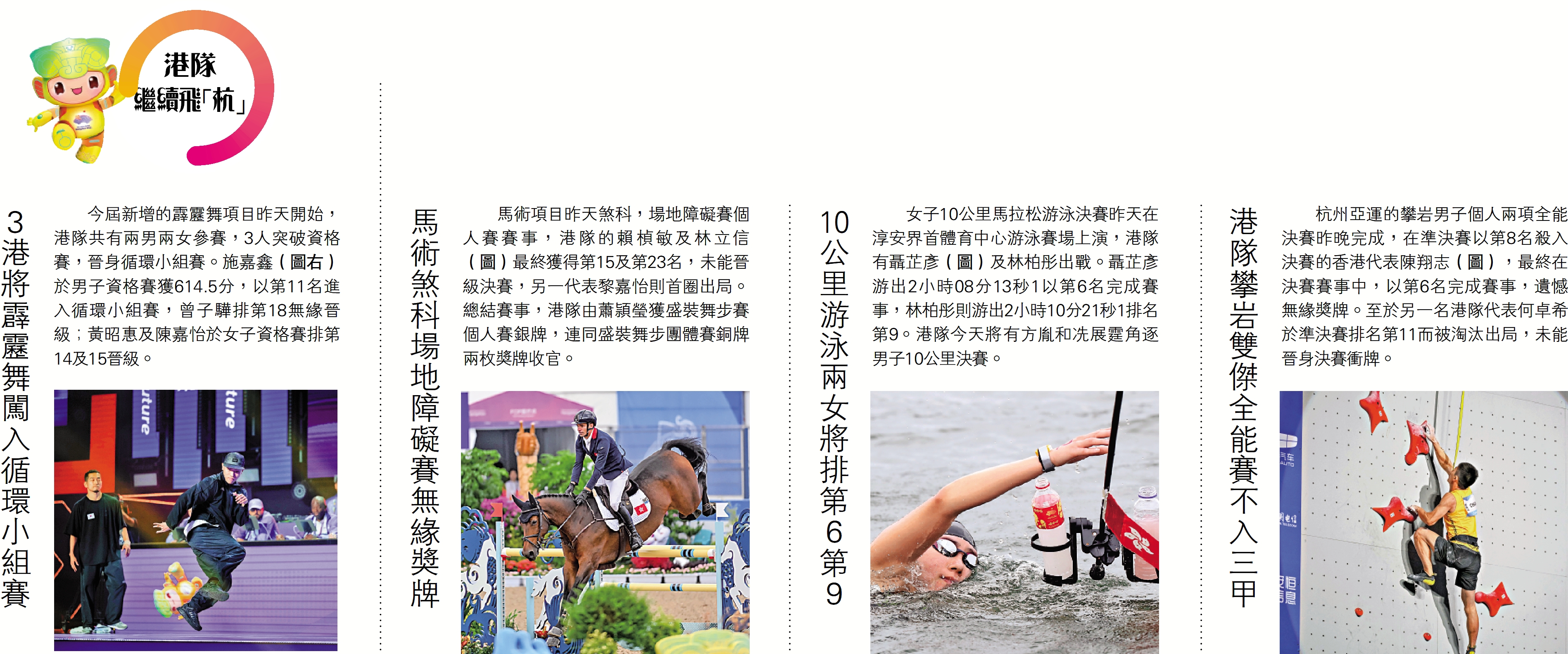 馬術項目昨天煞科,場地障礙賽個人賽賽事,港隊的賴楨敏及林立信(圖)最終獲得第15及第23名,未能晉級決賽,另一代表黎嘉怡則首圈出局。總結賽事,港隊由蕭頴瑩獲盛裝舞步賽個人賽銀牌,連同盛裝舞步團體賽銅牌兩枚獎牌收官。