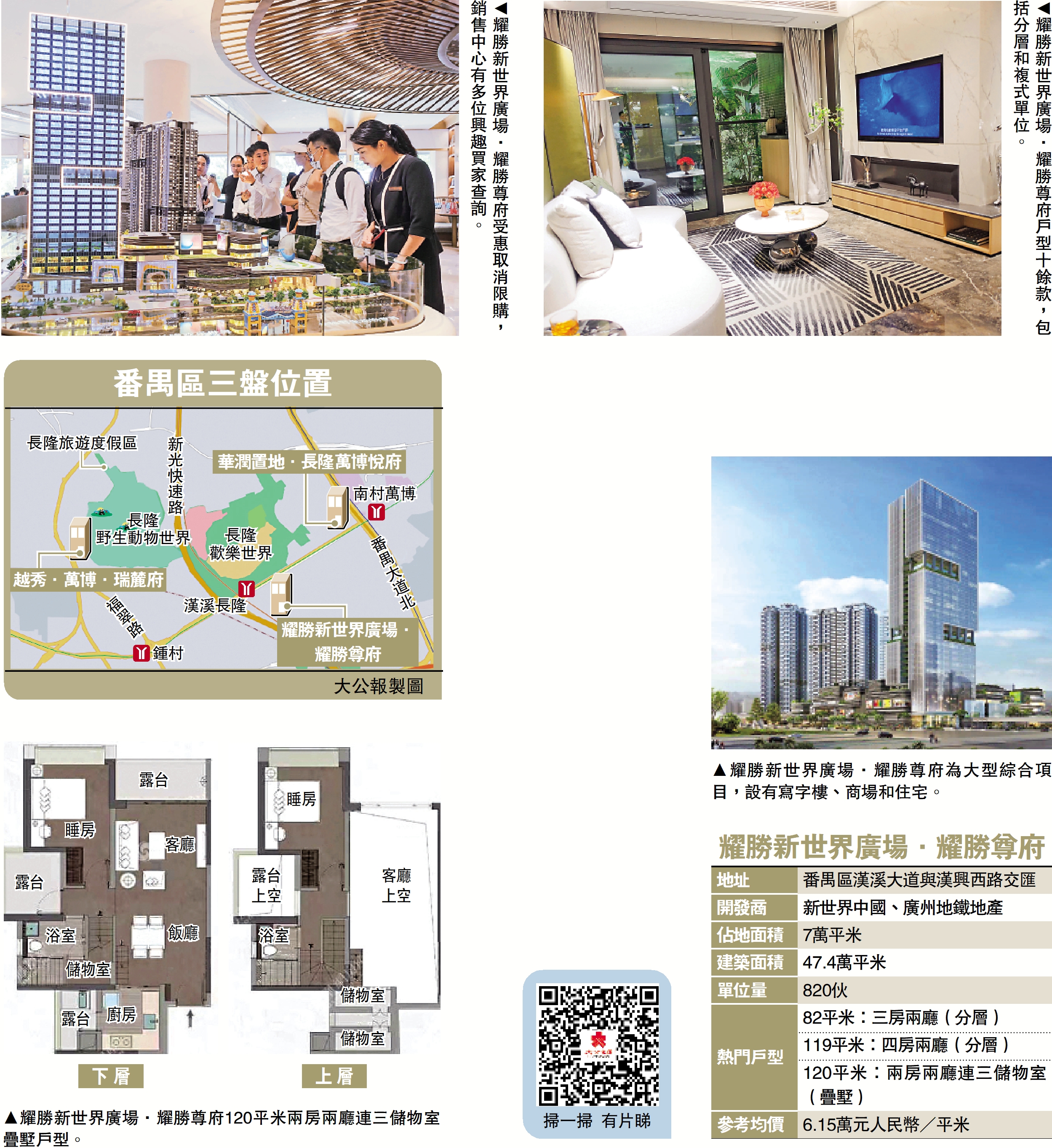 樓市金九銀十銷售進入決勝階段。廣州自9月20日起宣布開放黃埔、番禺、花都和白雲部分區域的住房限購,增值稅「五改二」的政策也同步落地,大大降低入市門檻。港資地產項目耀勝新世界廣場·耀勝尊府(下稱耀勝尊府)位於取消限購的番禺,加上靠近廣州南站和長隆萬博CBD,睇樓客大增2.4倍,當中不少是港人。\大公報記者 盧靜怡廣州報道