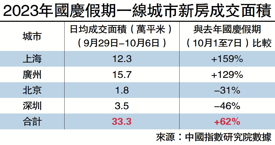 中國指數研究院報告顯示,今年國慶假期期間(9月29日-10月6日),35個代表城市日均成交面積較去年國慶假期(10月1日-7日)及2019年假期下降兩成左右。一線城市中,上海、廣州在樓盤供應端帶動下情緒回升,北京、深圳、成都、杭州樓市表現相對平穩,武漢、蘇州、天津等地在房交會、新政顯效下市場活躍度得到提升,但市場持續性仍需觀察,短期市場依然有壓力。
