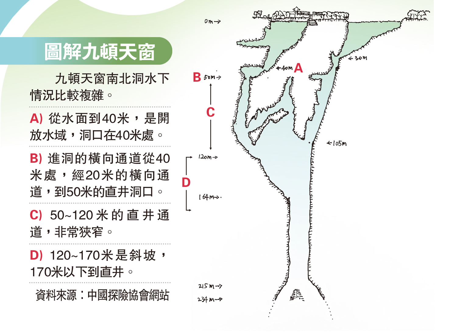 A) 從水面到40米,是開放水域,洞口在40米處。