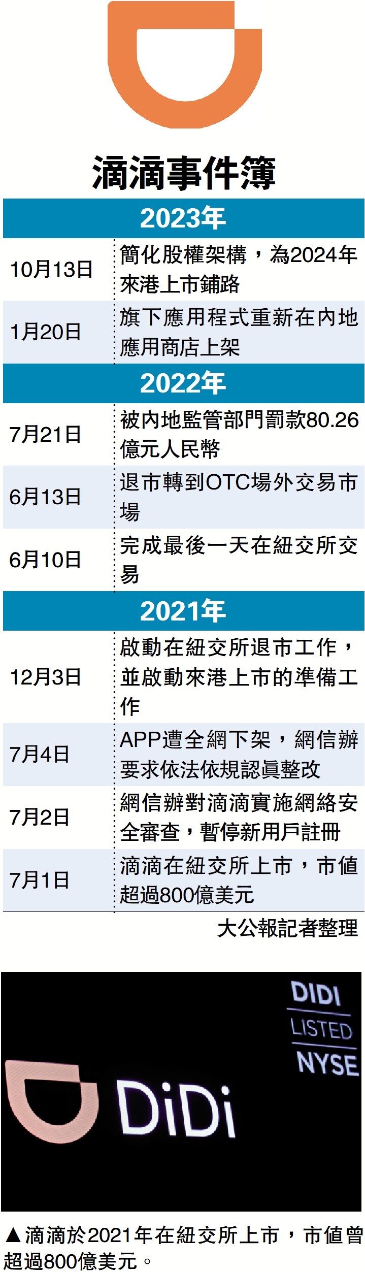 內地網約車龍頭滴滴正為來港上市鋪路。外電引述消息指出,為簡化股權架構,滴滴計劃向員工回購股份,計劃明年進行IPO。但在過去兩年,滴滴經歷整改與巨額罰款,估值已由高峰期的800億美元(約6240億港元),大幅縮水80%至160億美元(約1248億港元)。\大公報記者 李潔儀