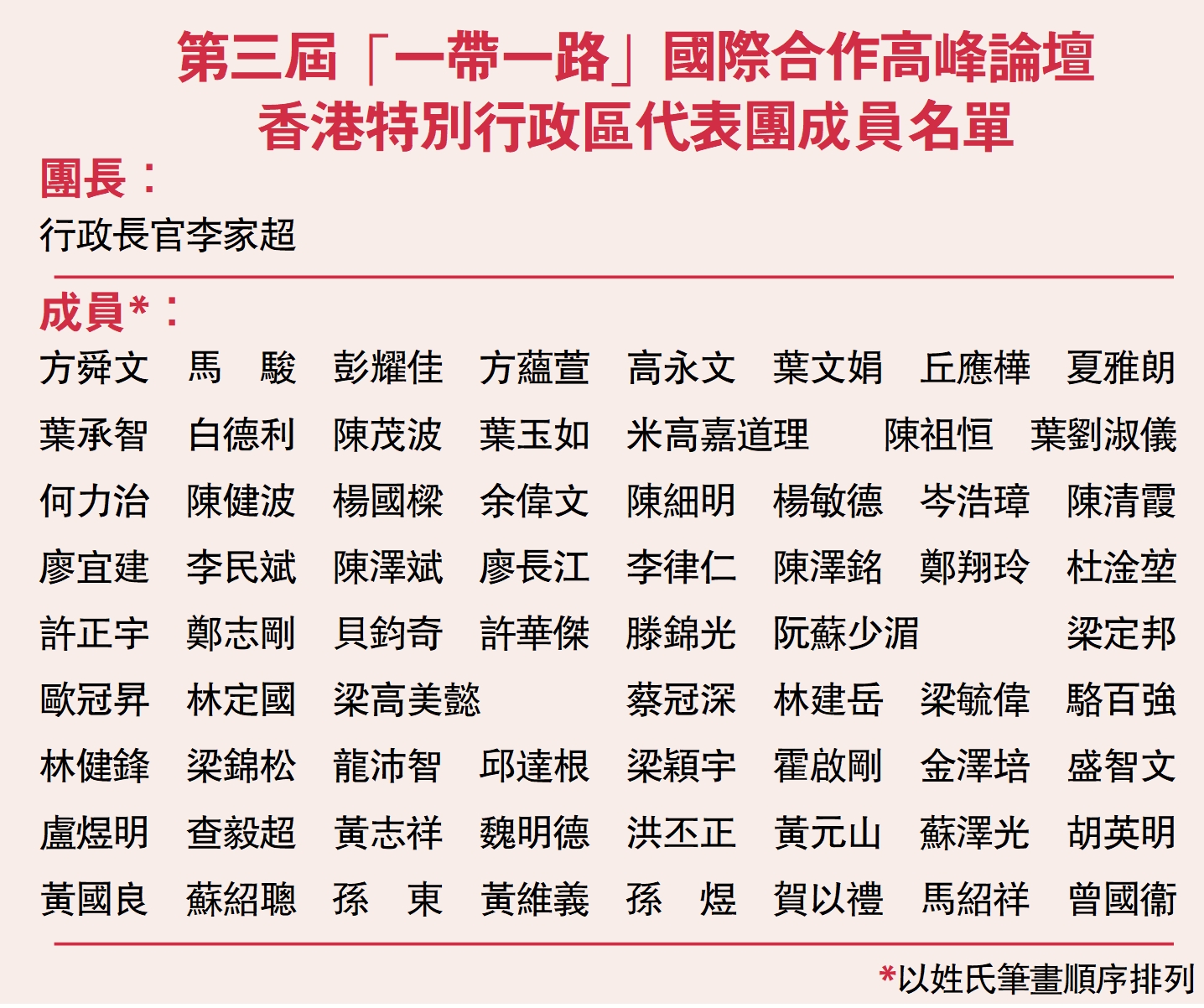 70人的特區代表團由行政長官率領,官方成員包括六位司局長:財政司司長陳茂波、律政司司長林定國、政制及內地事務局局長曾國衞、財經事務及庫務局局長許正宇、商務及經濟發展局局長丘應樺和創新科技及工業局局長孫東,加上廉政專員胡英明、行政長官辦公室主任葉文娟、特首政策組組長黃元山及「一帶一路」專員何力治,共11位高層官員參與。