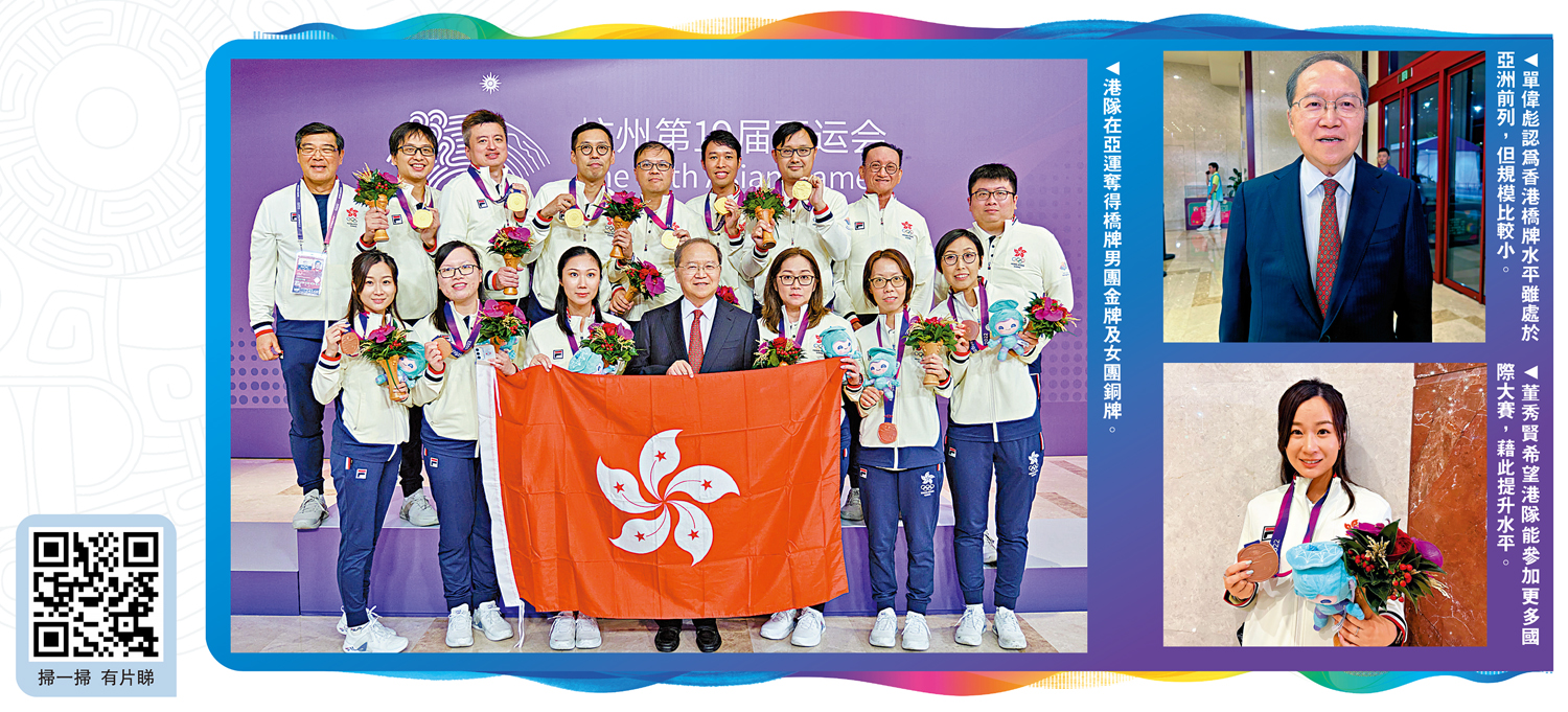 作為一項傳統智力項目,橋牌從2018年雅加達亞運會開始,連續兩屆作為亞運會正式比賽項目。杭州亞運會上,港隊在比賽項目減半情況下,奪得男團金牌和女團銅牌兩賽獎項,並成為香港首個在亞運會收穫金牌的智力項目。特區政府加大資助力度、年齡結構合理、賽前強化訓練是港隊奪得佳績的重要原因。中國香港橋牌會主席、港隊領隊單偉彪表示,借助本次亞運會,橋牌項目在香港有望進一步得到關注,發展按下加速鍵。下一屆,橋牌項目若第三度「入亞」,將成為亞運會永久比賽項目,有望成為香港爭奪獎牌重點項目之一。\大公報記者 敖敏輝(文、圖)